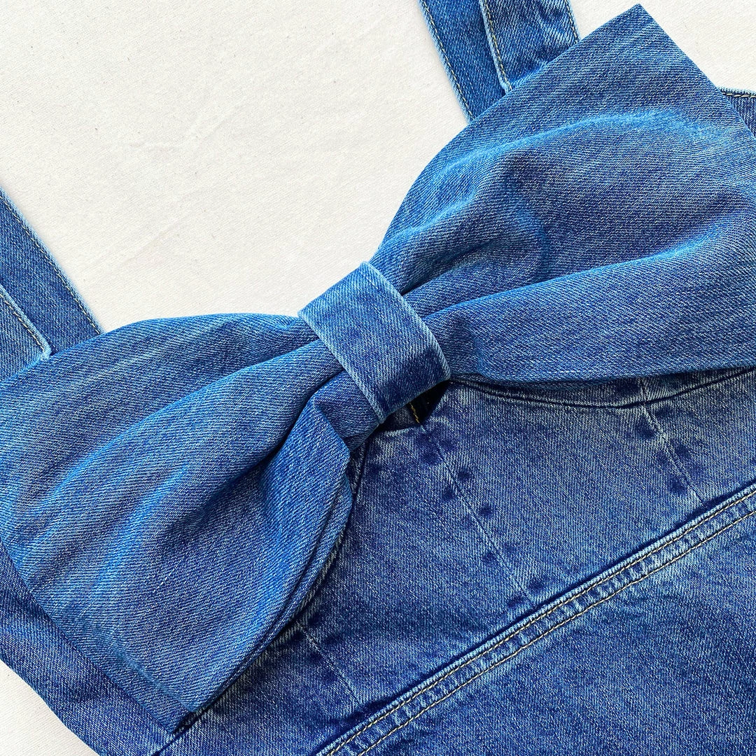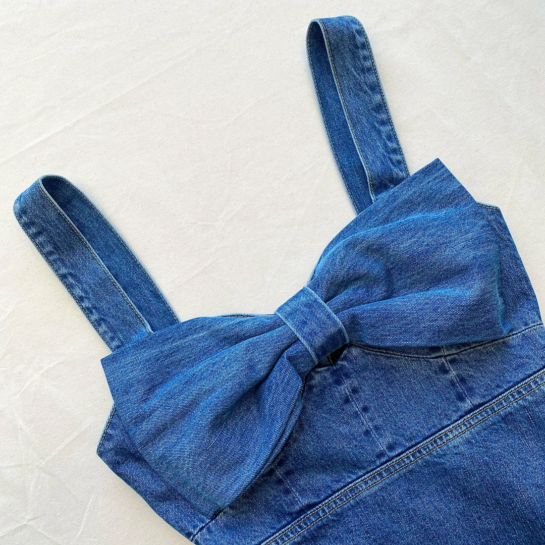 This mini dress is cut from blue wash denim. It is designed with a bow detail at the bodice. It is fitted through the skirt and is finished with a slight curved hem. It fastens with an exposed zip at the back. Check the Size Guide to find your perfect fit.