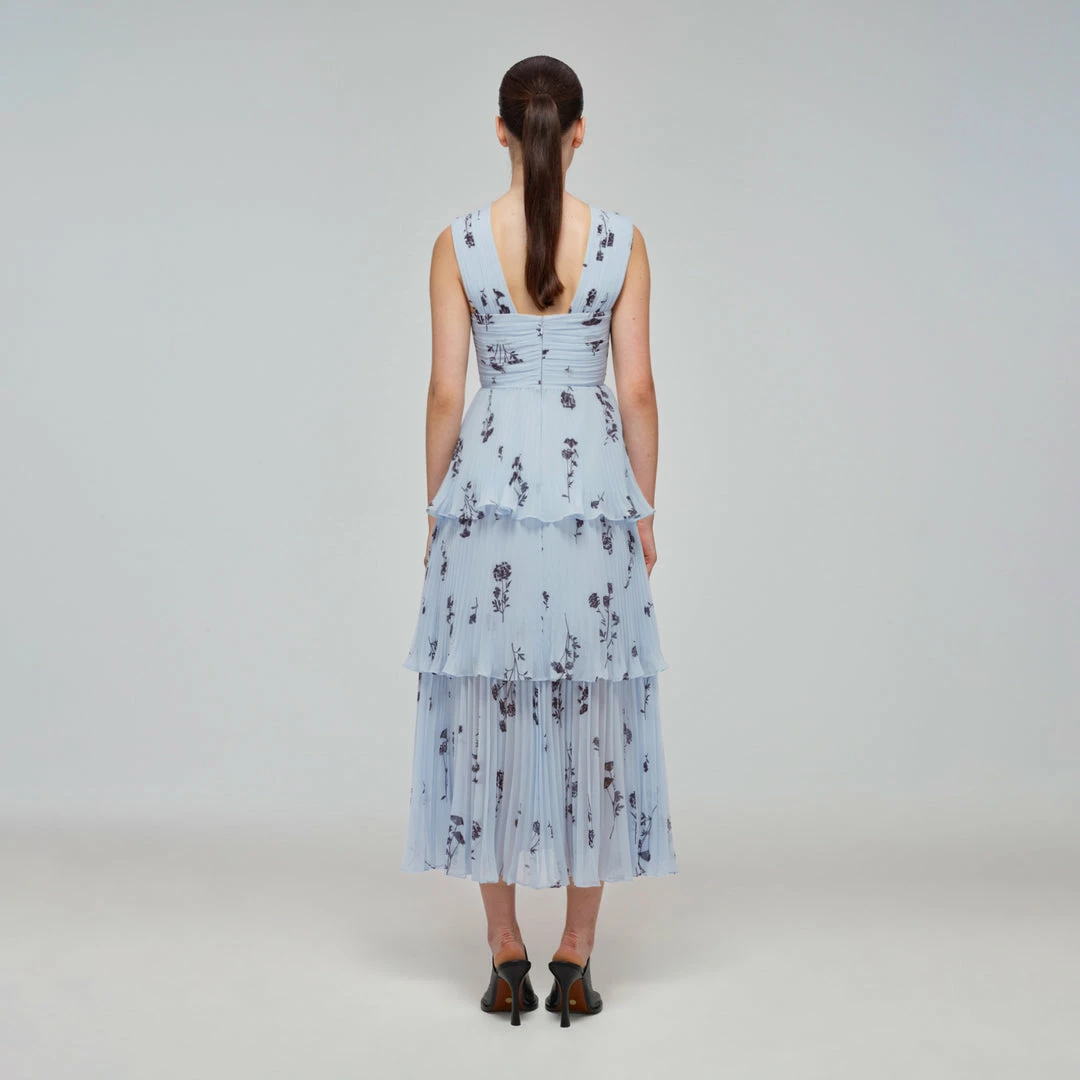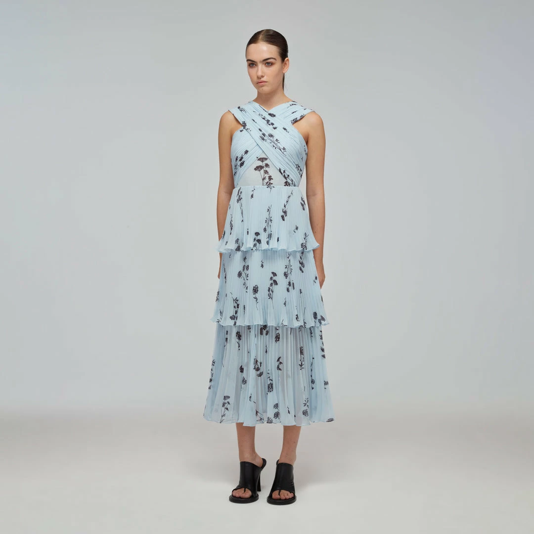 Self-portrait READY TO WEAR Blue Floral Silhouette Chiffon Crossover Midi Dress