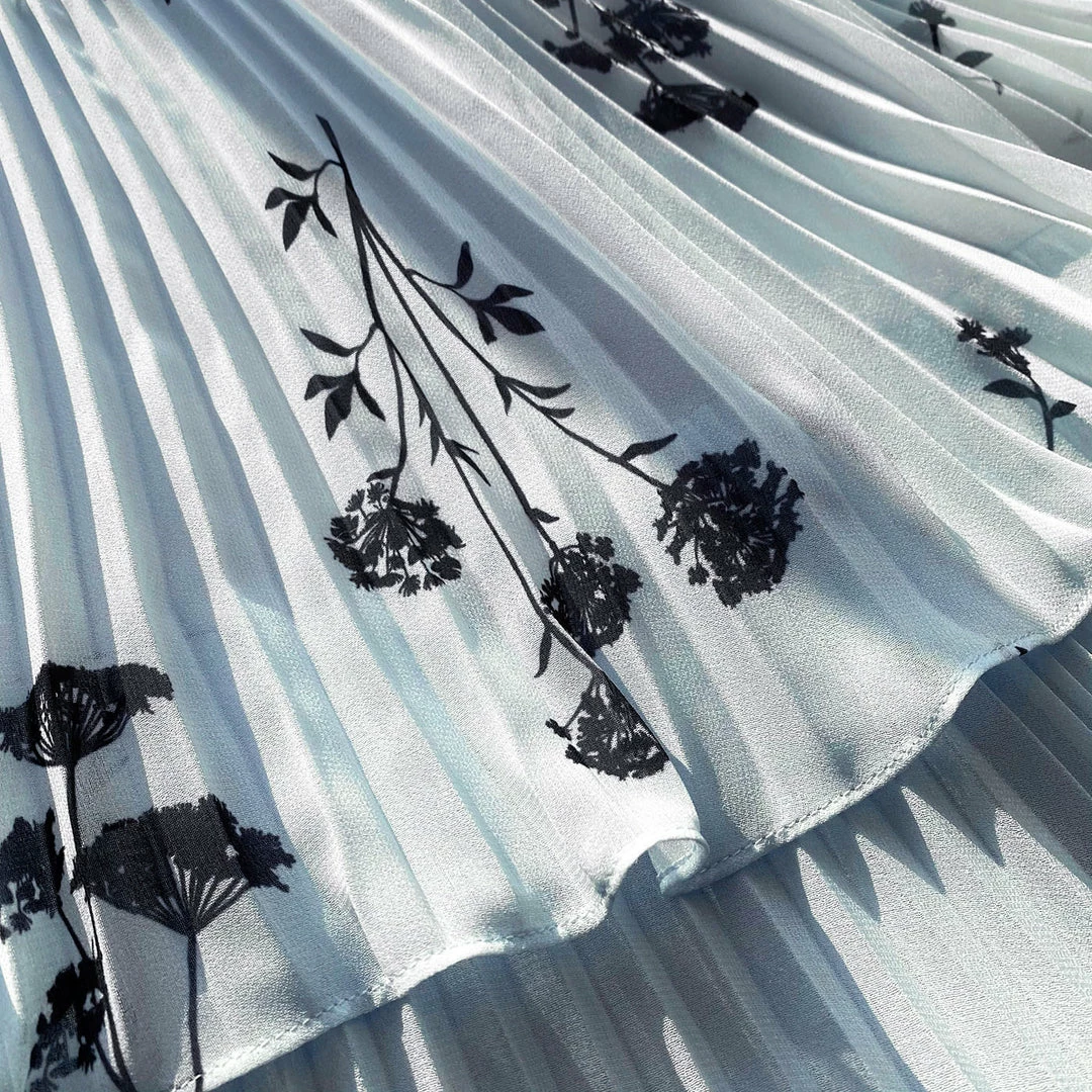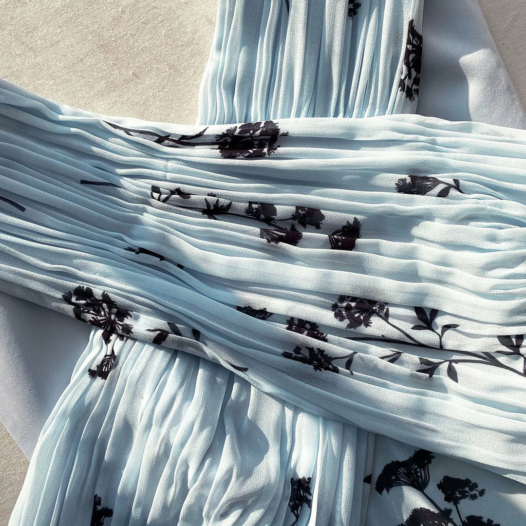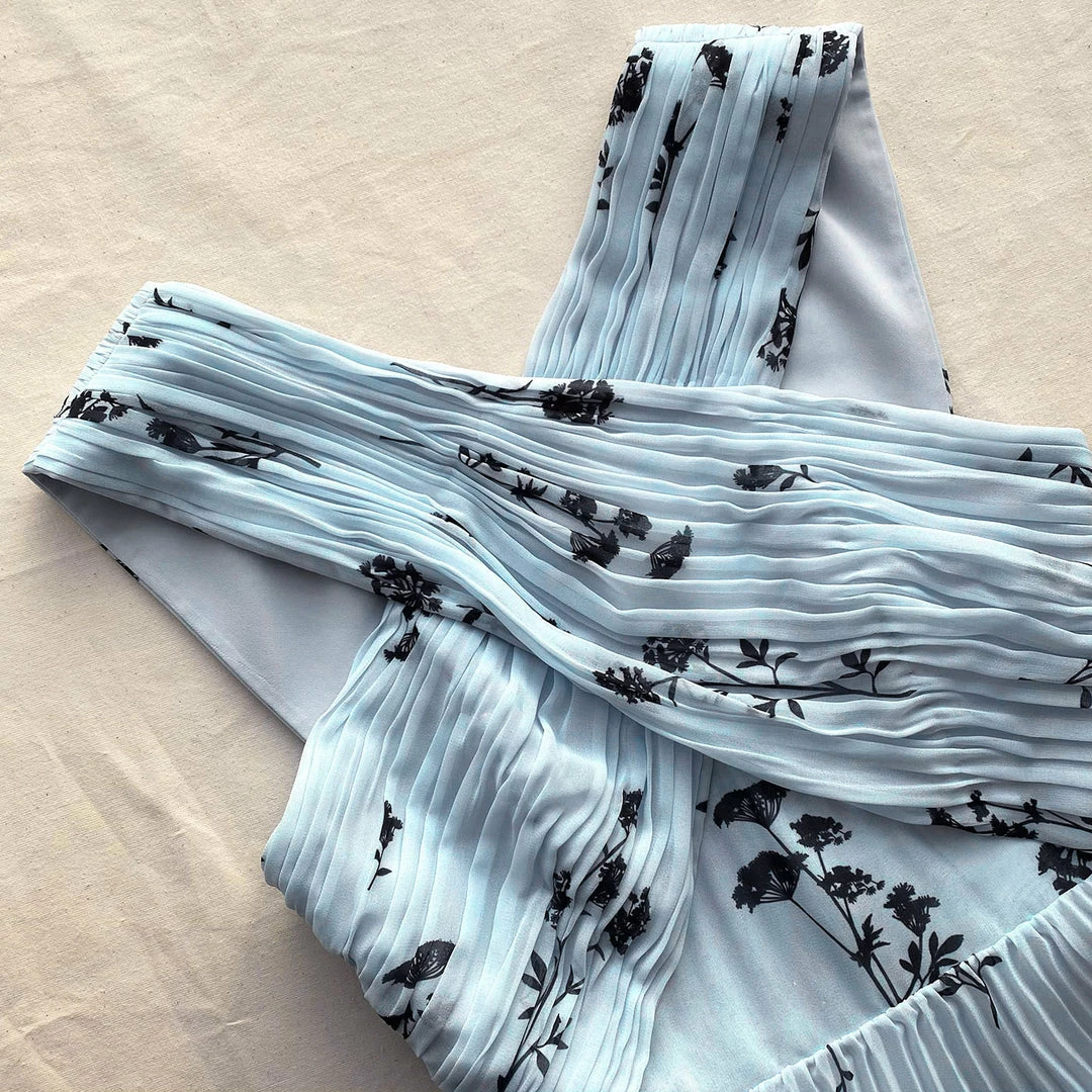 This midi dress is cut from blue floral silhouette print chiffon. It is designed with a flattering cross over halter style bodice and is fitted at the waist. The skirt falls to a pleated tiered midi length. Check the Size Guide to find your perfect fit.