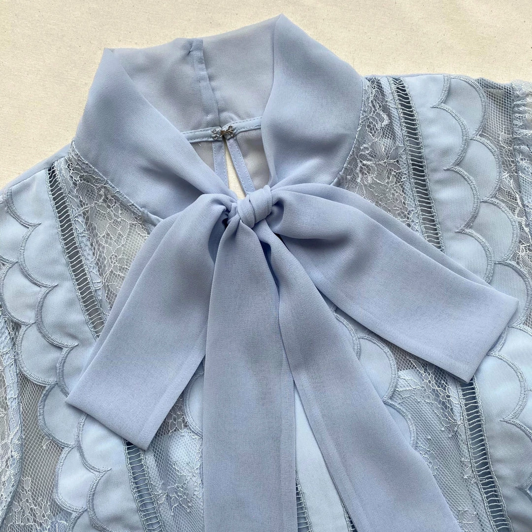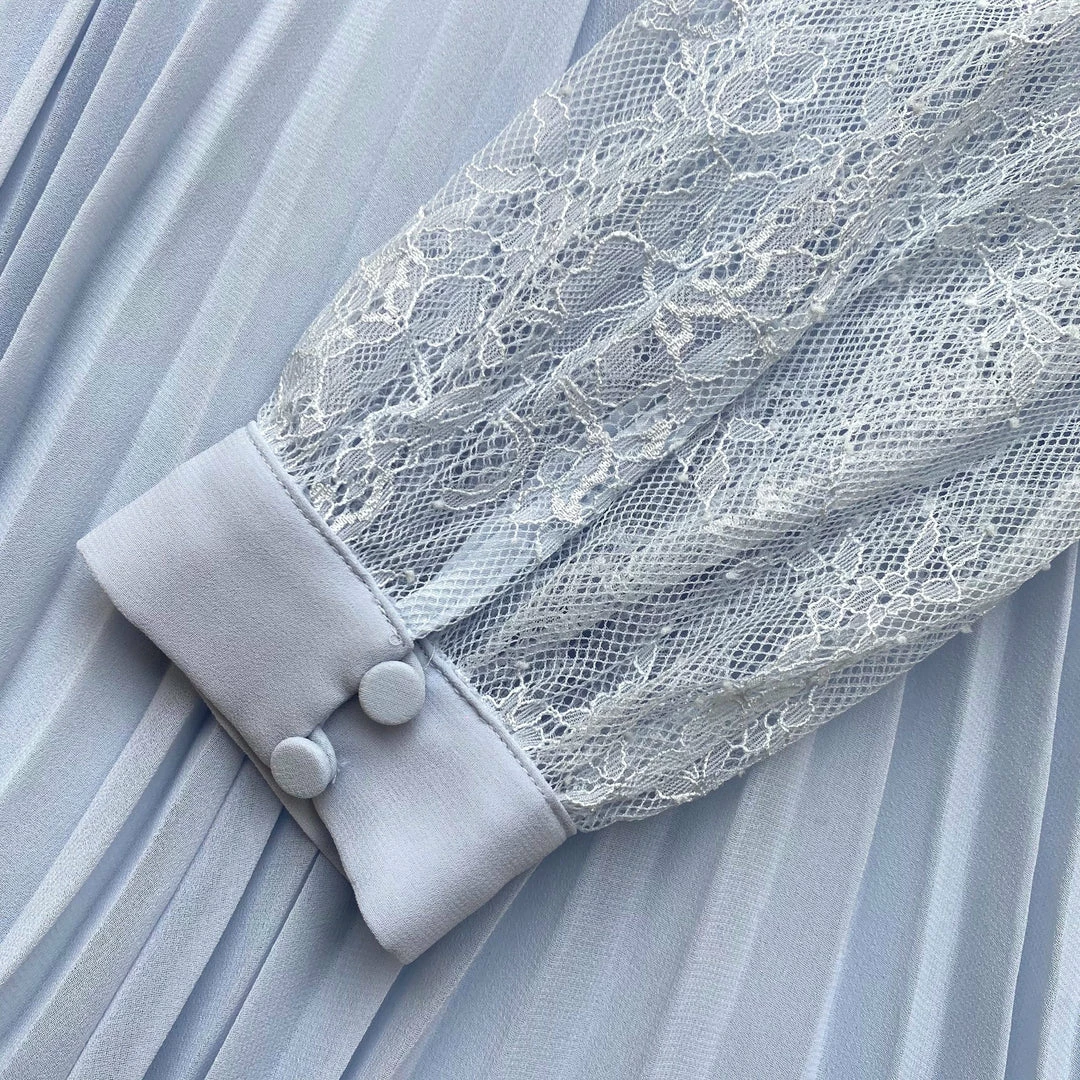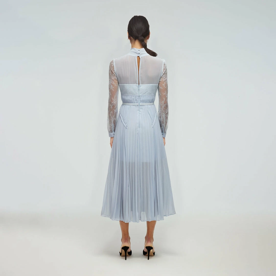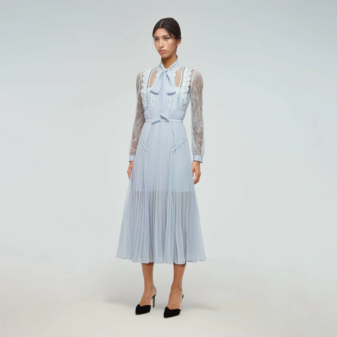 This midi dress is cut from fine lace and chiffon. It features delicate scalloped trims and ties to a bow at the neck. The sleeves are cut from fine lace. This dress is fitted at the waist and the pleated skirt falls to a flared silhouette. Check the Size Guide to find your perfect fit.