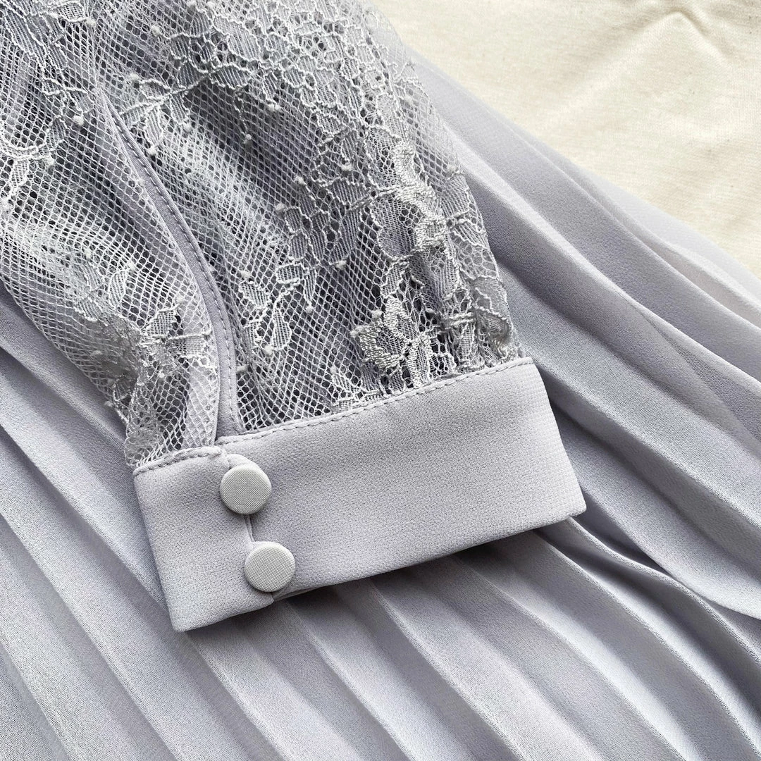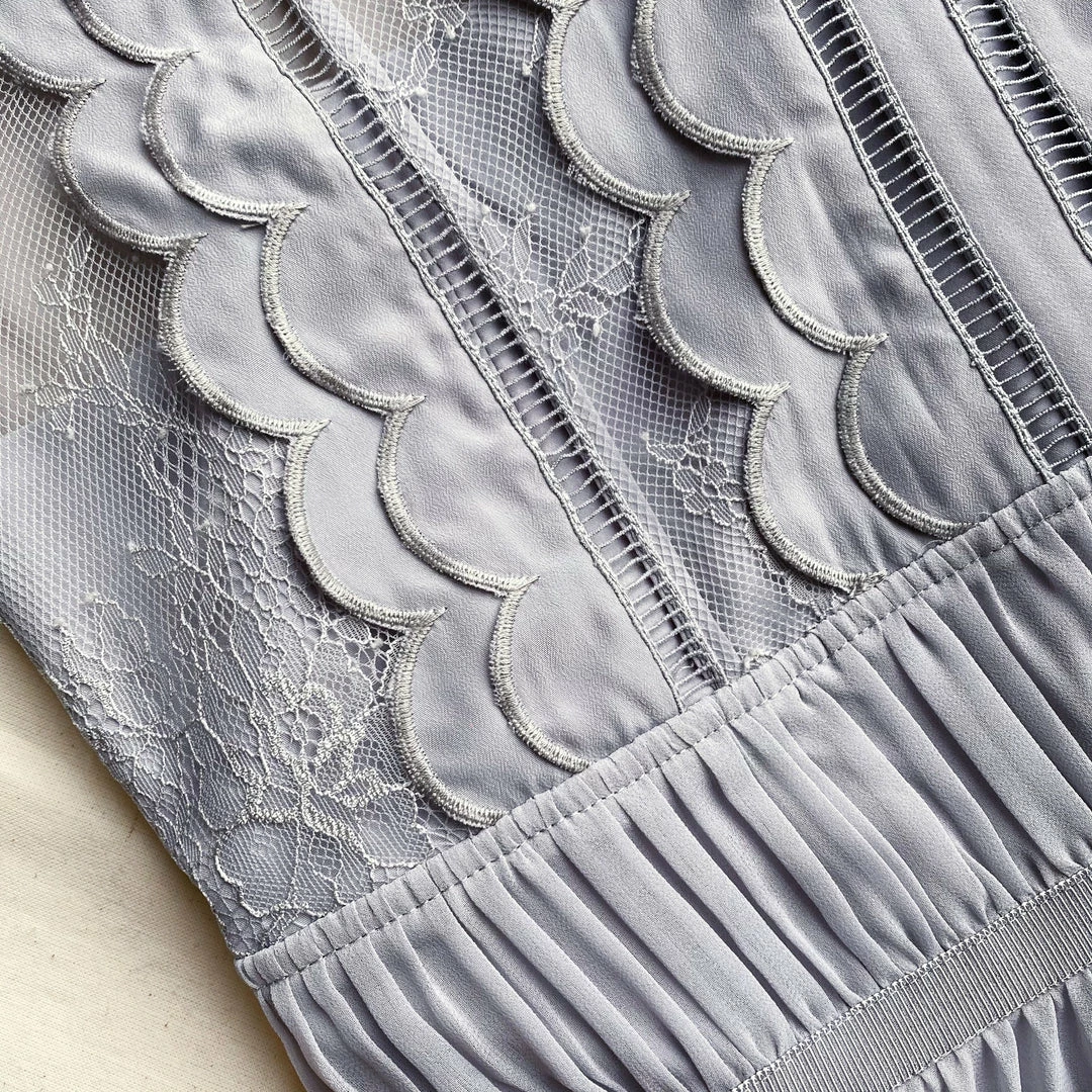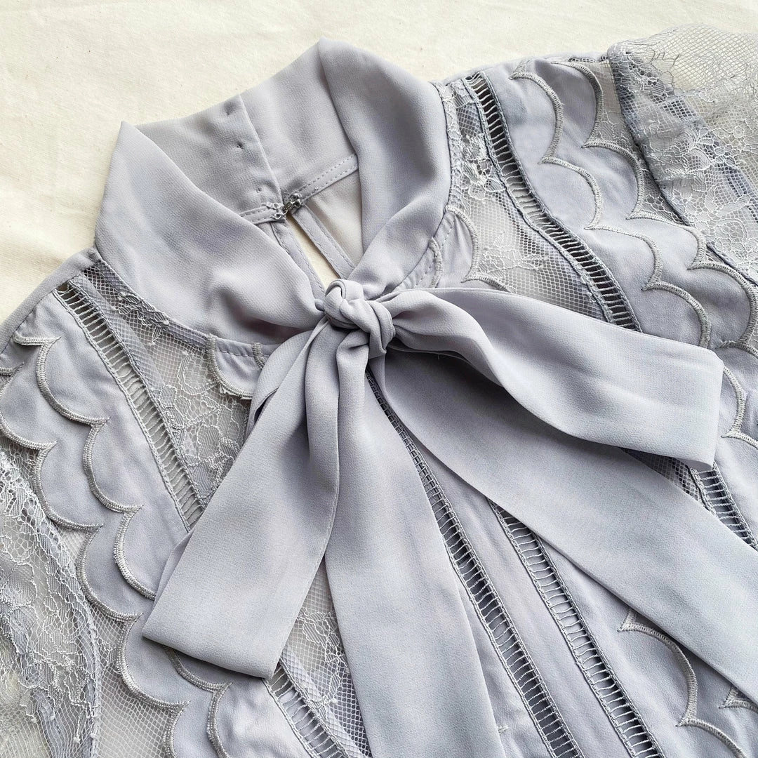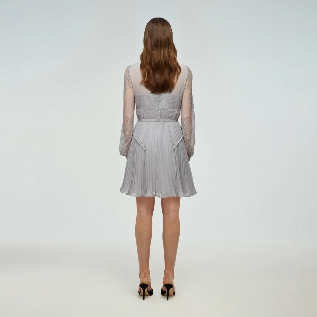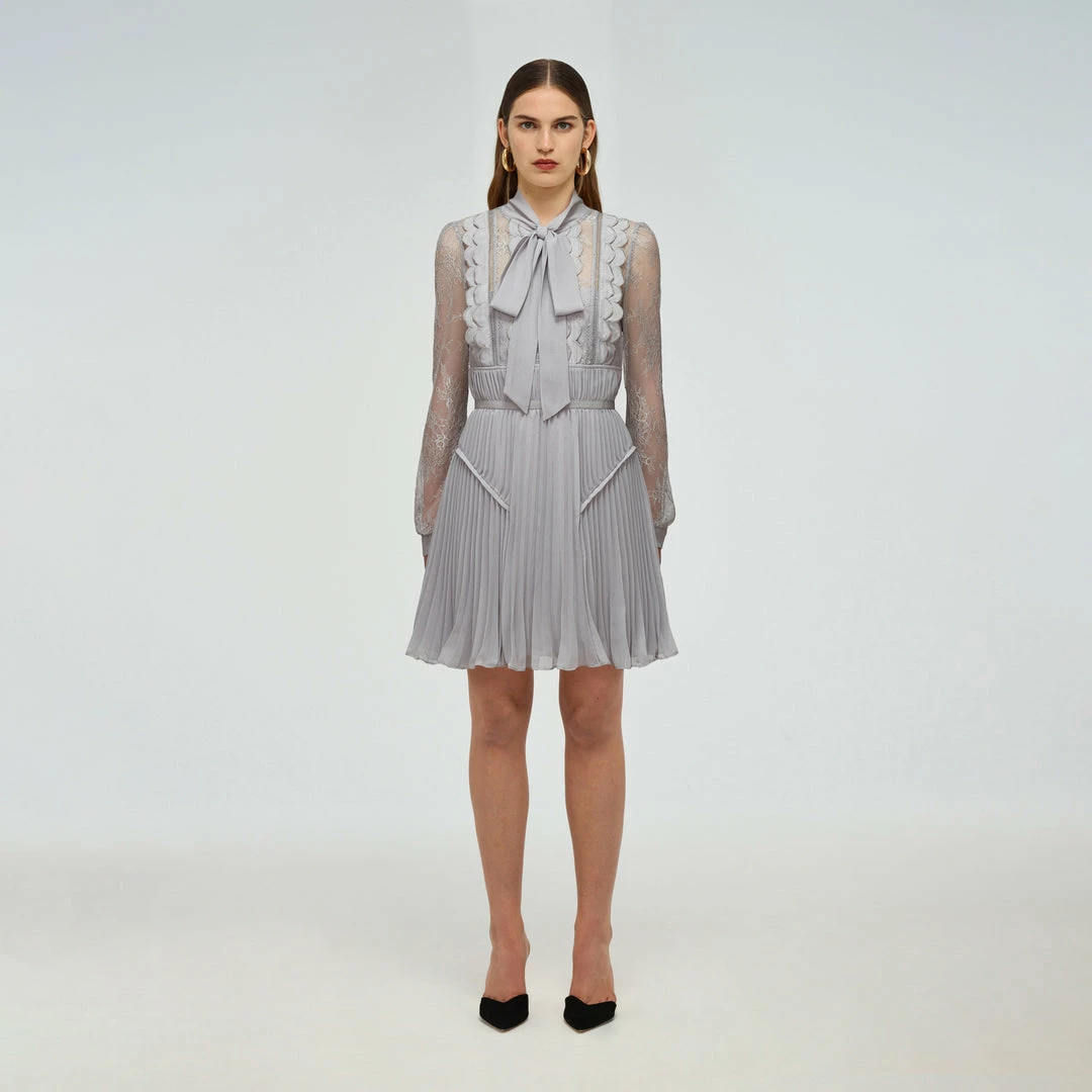 This mini dress is cut from fine lace and chiffon. It features delicate scalloped trims and ties to a bow at the neck. The sleeves are cut from fine lace. This dress is fitted at the waist and the pleated skirt falls to a flared silhouette. Check the Size Guide to find your perfect fit.