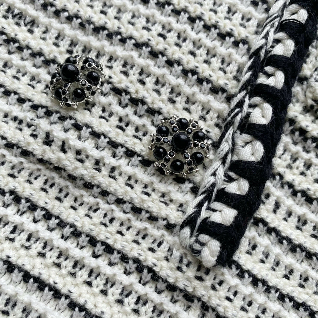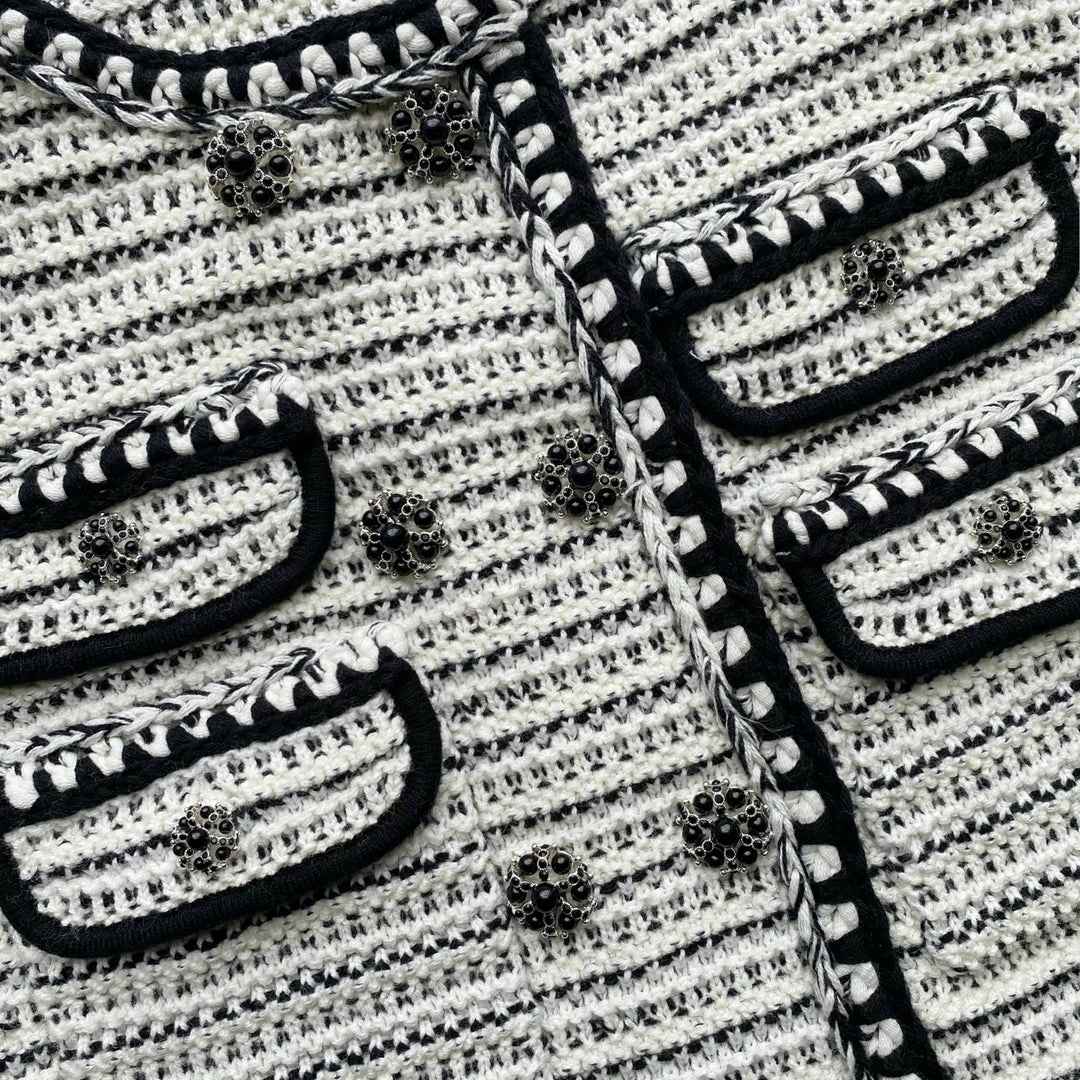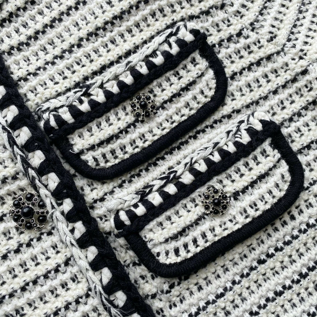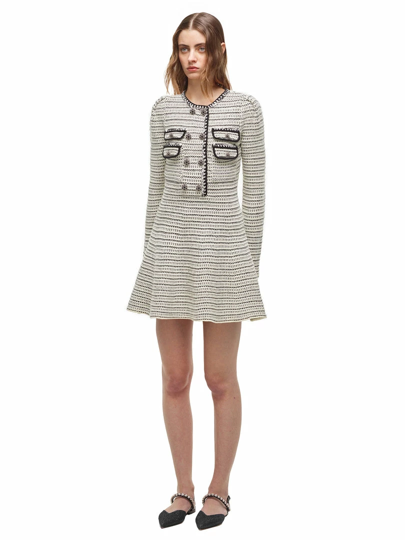 This monochrome knit dress features a double breasted functional bodice with floral diamante buttons. It is fitted in the bodice and falls to a flared mini skirt. Check the Size Guide to find your perfect fit.