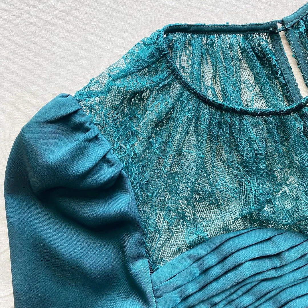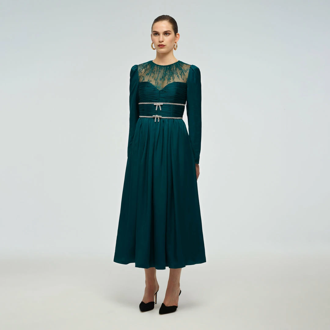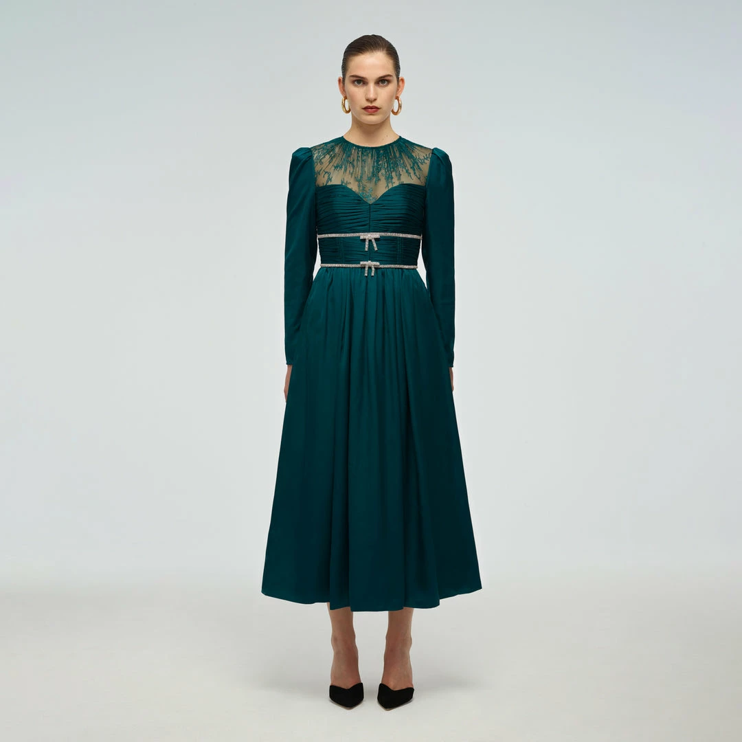 This longsleeve midi dress is cut from fluid twill. It features a sweetheart neckline and a contrast fine lace yoke. It is designed with ruching through the sleeves and bodice. The waist is finshed with a diamante bow trim and the skirt falls to a pleated midi length. Check the Size Guide to find your perfect fit.