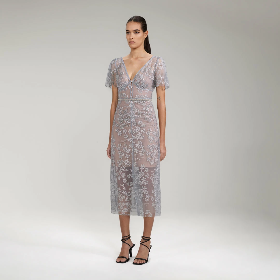 This unforgettable midi dress pairs floral embroidered mesh with a signature silhouette. Fluted sleeves, a V neckline and slim skirt help paint an elegant frame, whilst a detachable diamanté belt cinches it in at the waist. Complement the embellishments with more jewels at a celebration where you plan on being the star of the show. Check the Size Guide to find your perfect fit.