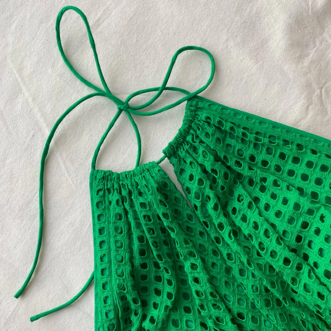A guaranteed head-turner, this mini is cut from broderie anglaise in a vivid shade of bright green. A halter neckline helps accentuateyour shoulders and back, while its fitted waist and gathered skirt will elongate your legs. Throw it on under a leather blazer for your next night out. Check the Size Guide to find your perfect fit.