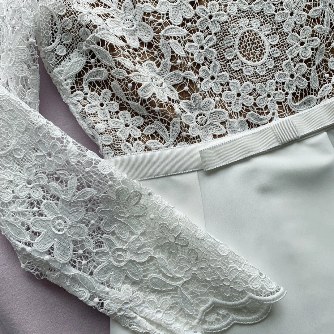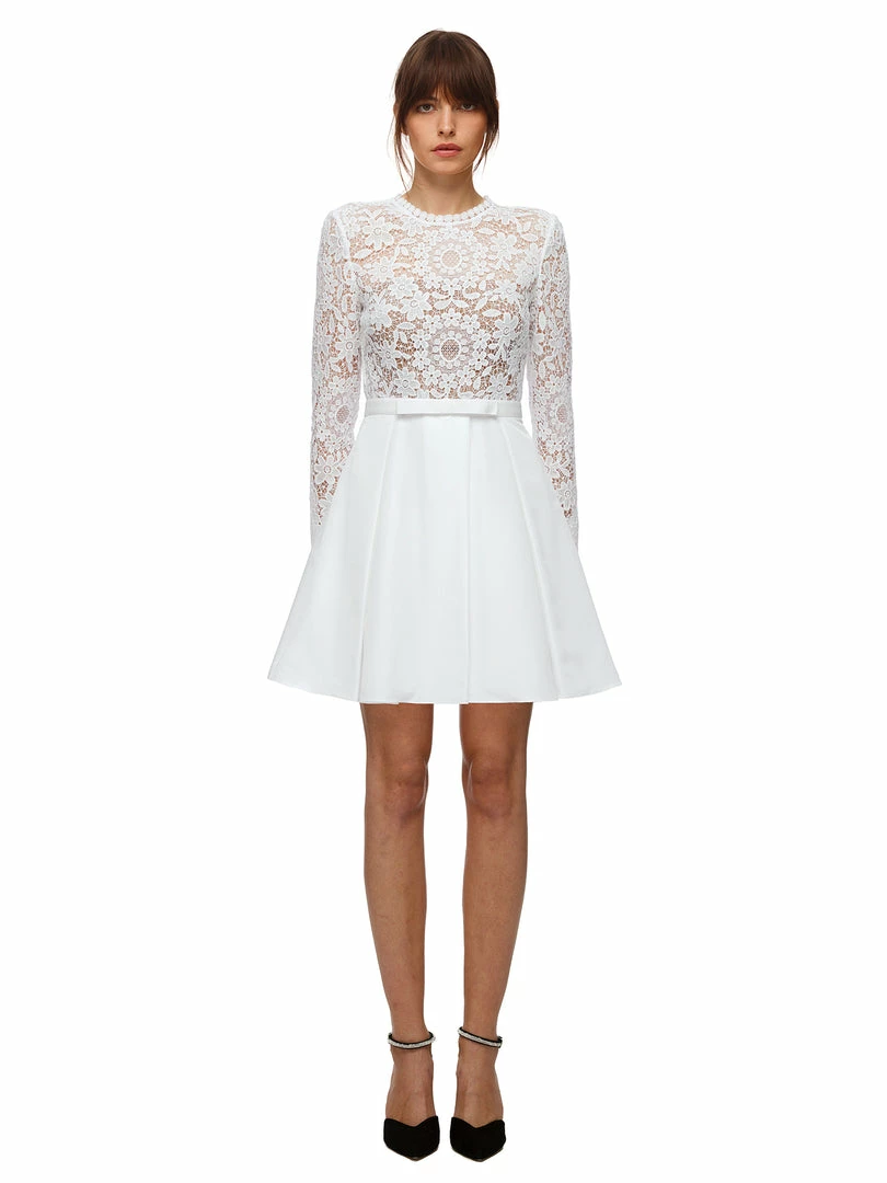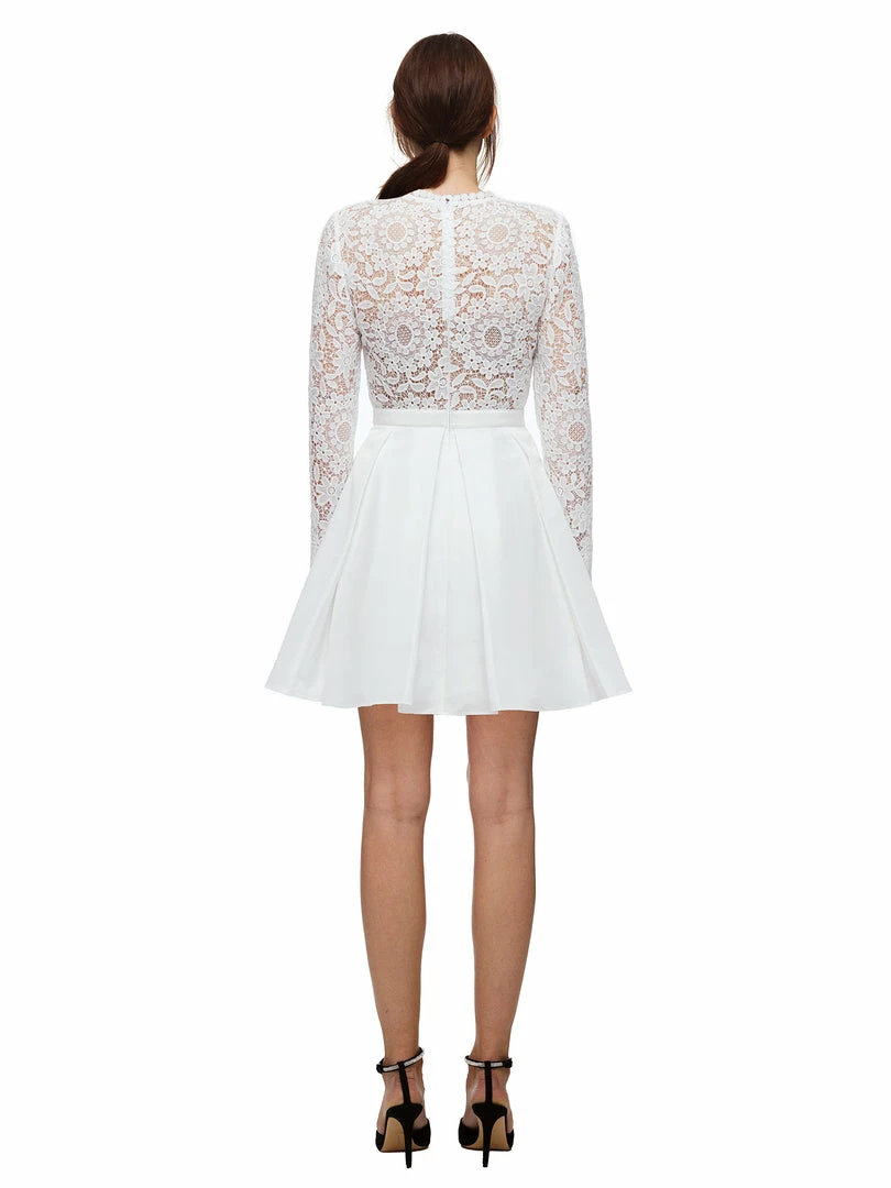 This exclusive white mini dress features a floral guipure lace bodice and is lined to the waist with a nude bandeau. The skirt features box pleats for a full silhouette. This style is lined. Check the Size Guide to find your perfect fit.