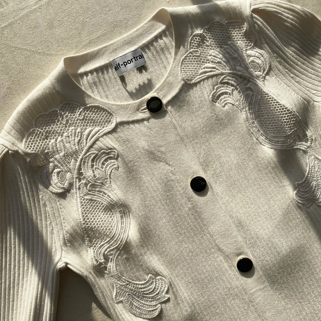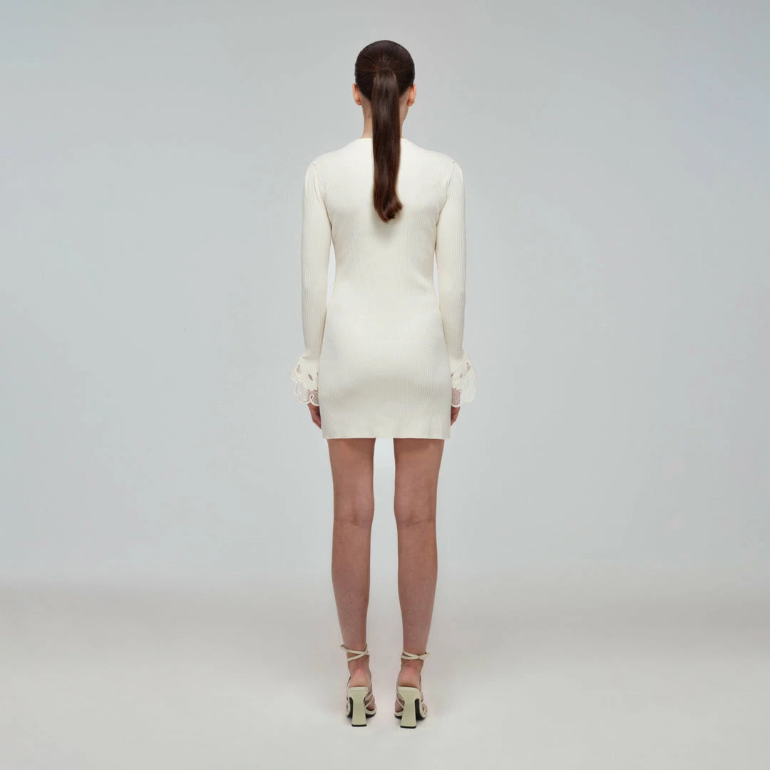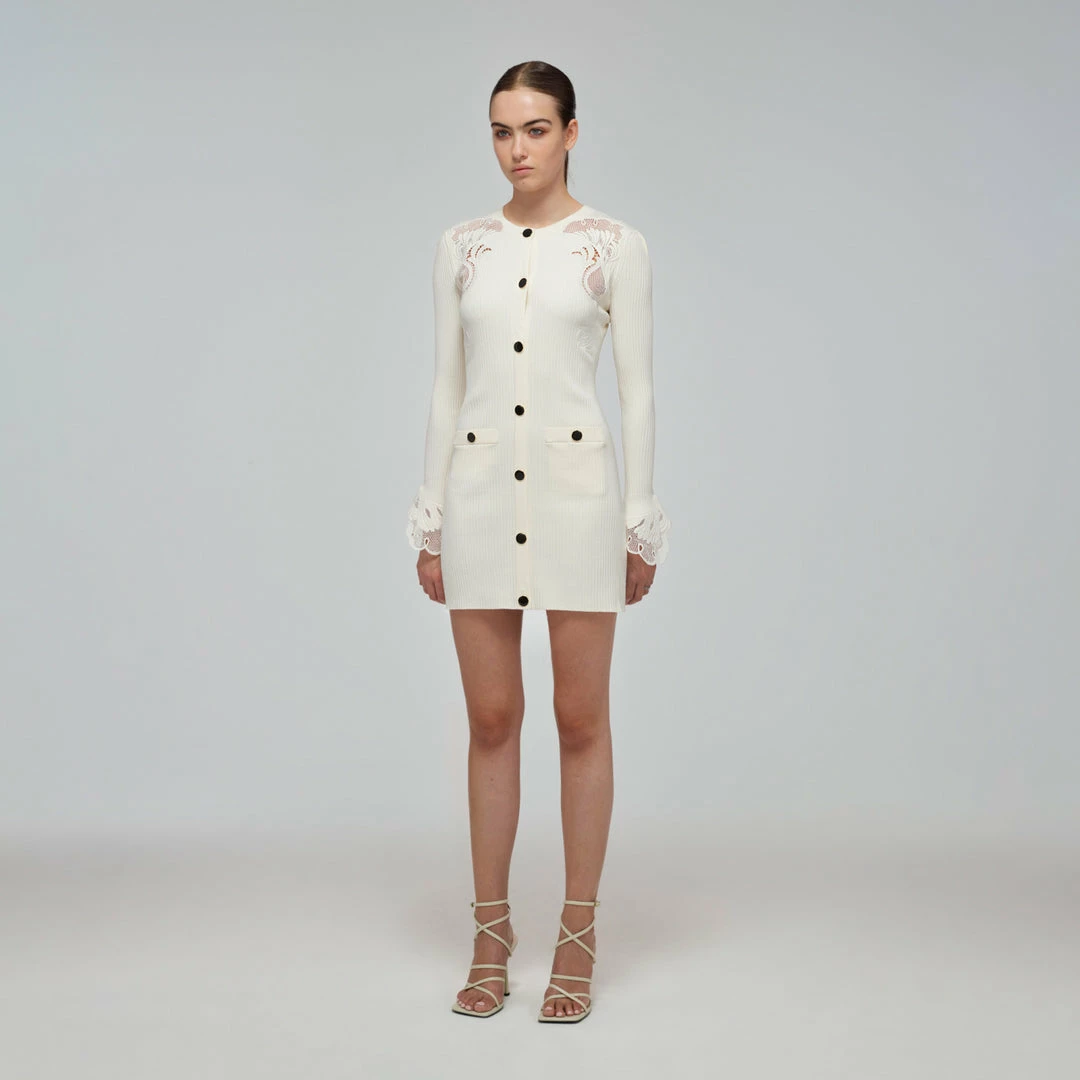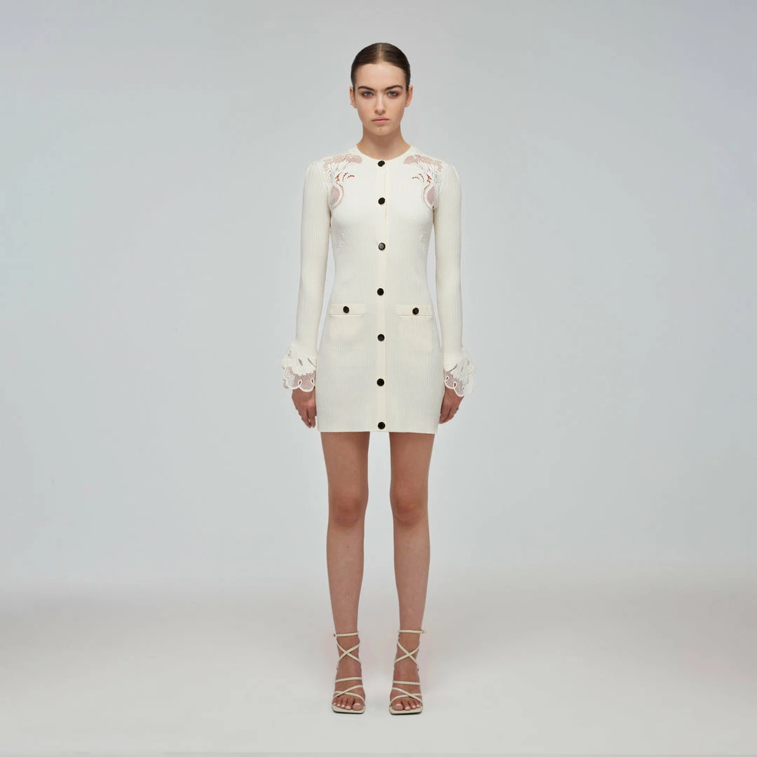 Self-portrait READY TO WEAR Ivory Inserted Lace Ribbed Knit Buttoned Dress