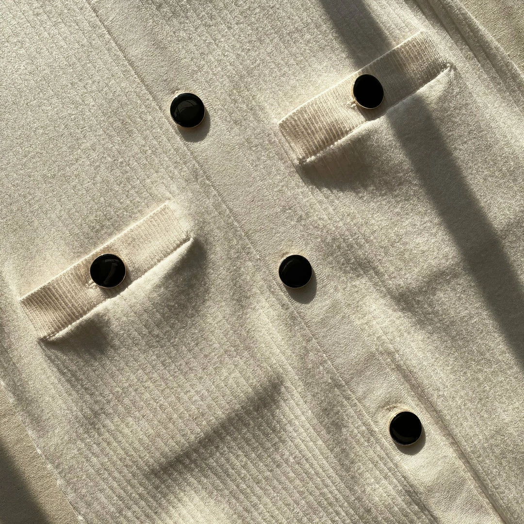 This ivory ribbed knit mini dress is designed with a round neck and inserted lace trims at the shoulders. It fastens at the front with contrast resin buttons and is fitted to a slim silhouette. Check the Size Guide to find your perfect fit.