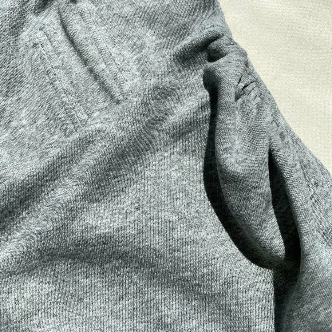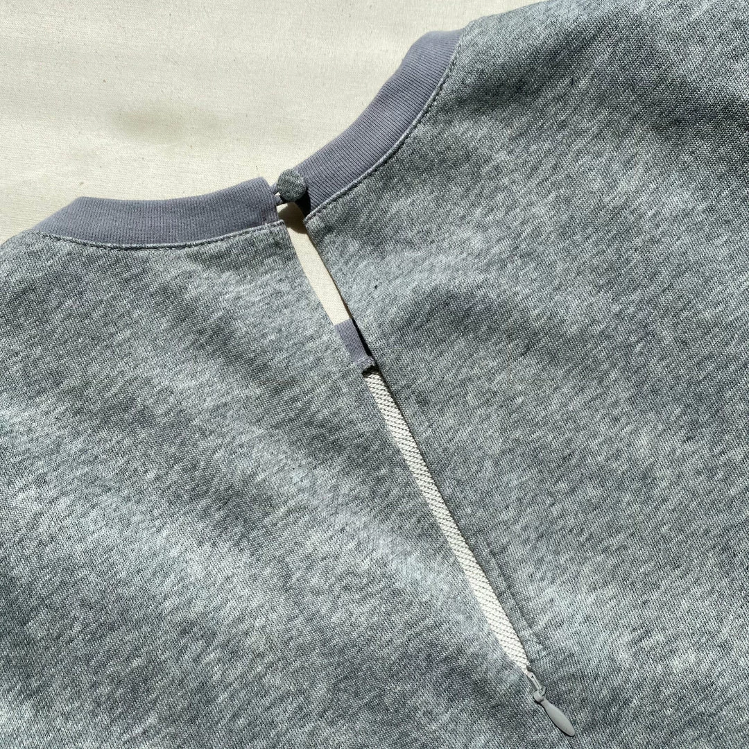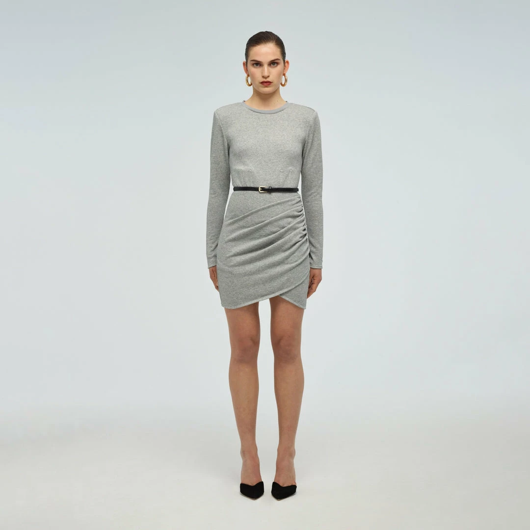 This long sleeve mini dress is cut from light grey marl jersey. The bodice is designed with seam details giving a fitted corset affect. It features a wrap mini skirt with gathering at the side. The shoulders are accentuated with removeable shoulder pads. Check the Size Guide to find your perfect fit.