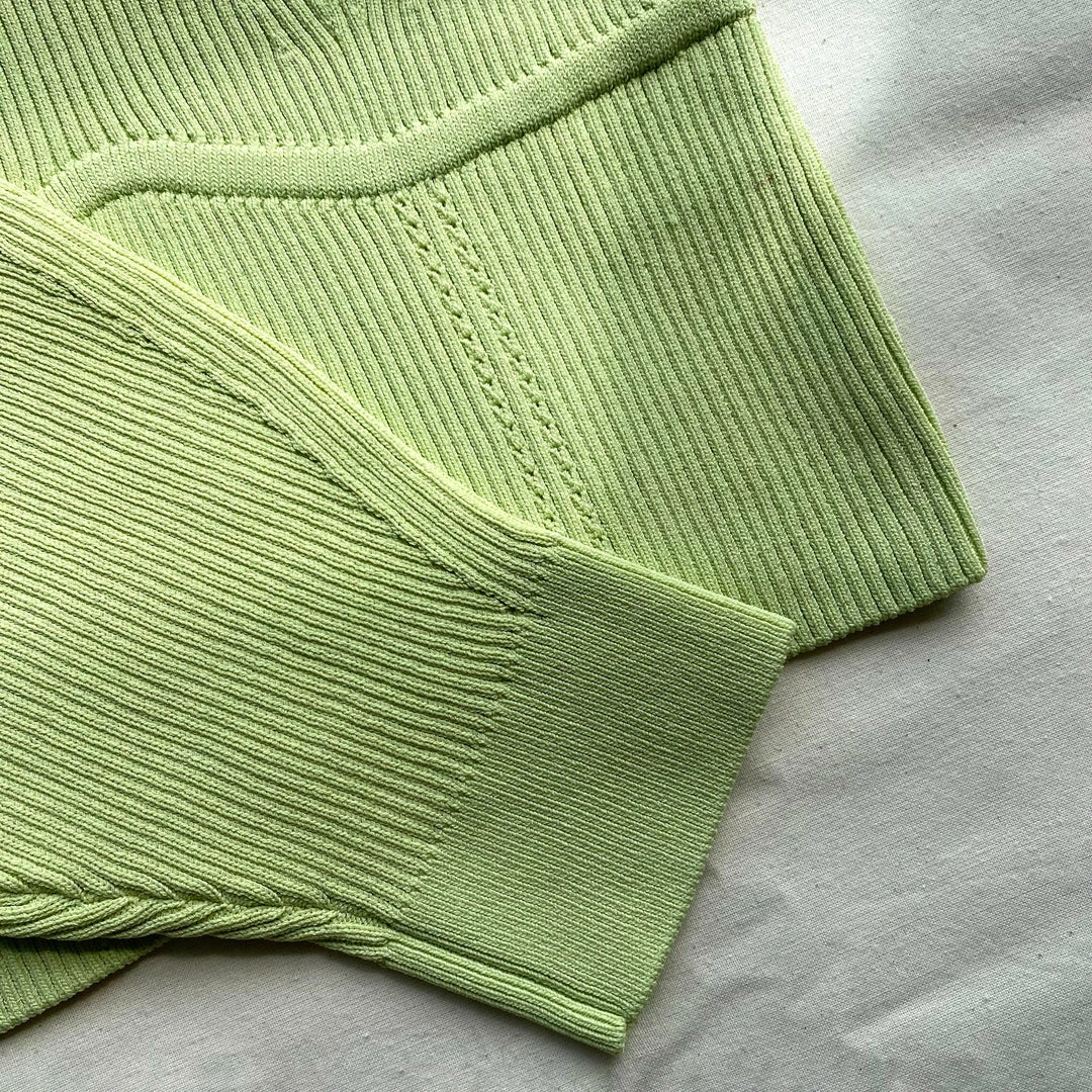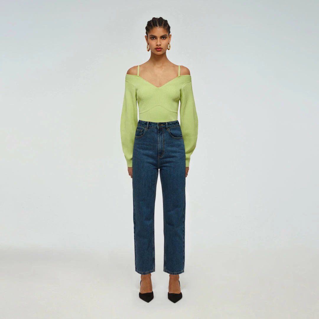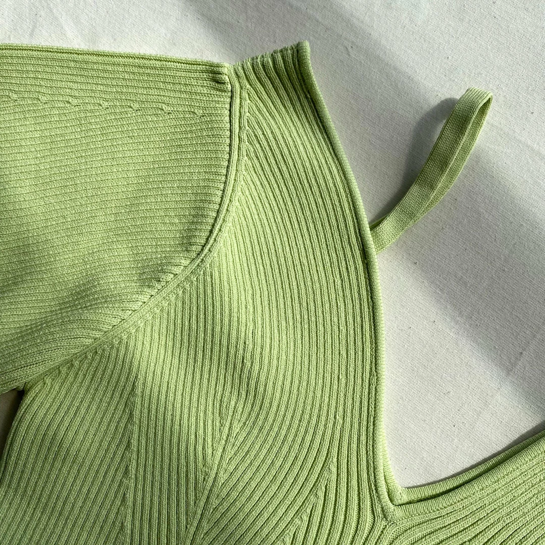 This green ribbed knit top is designed with an off shoulder sweetheart neckline. It features subtle balloon sleeves and bustier details. Check the Size Guide to find your perfect fit.
