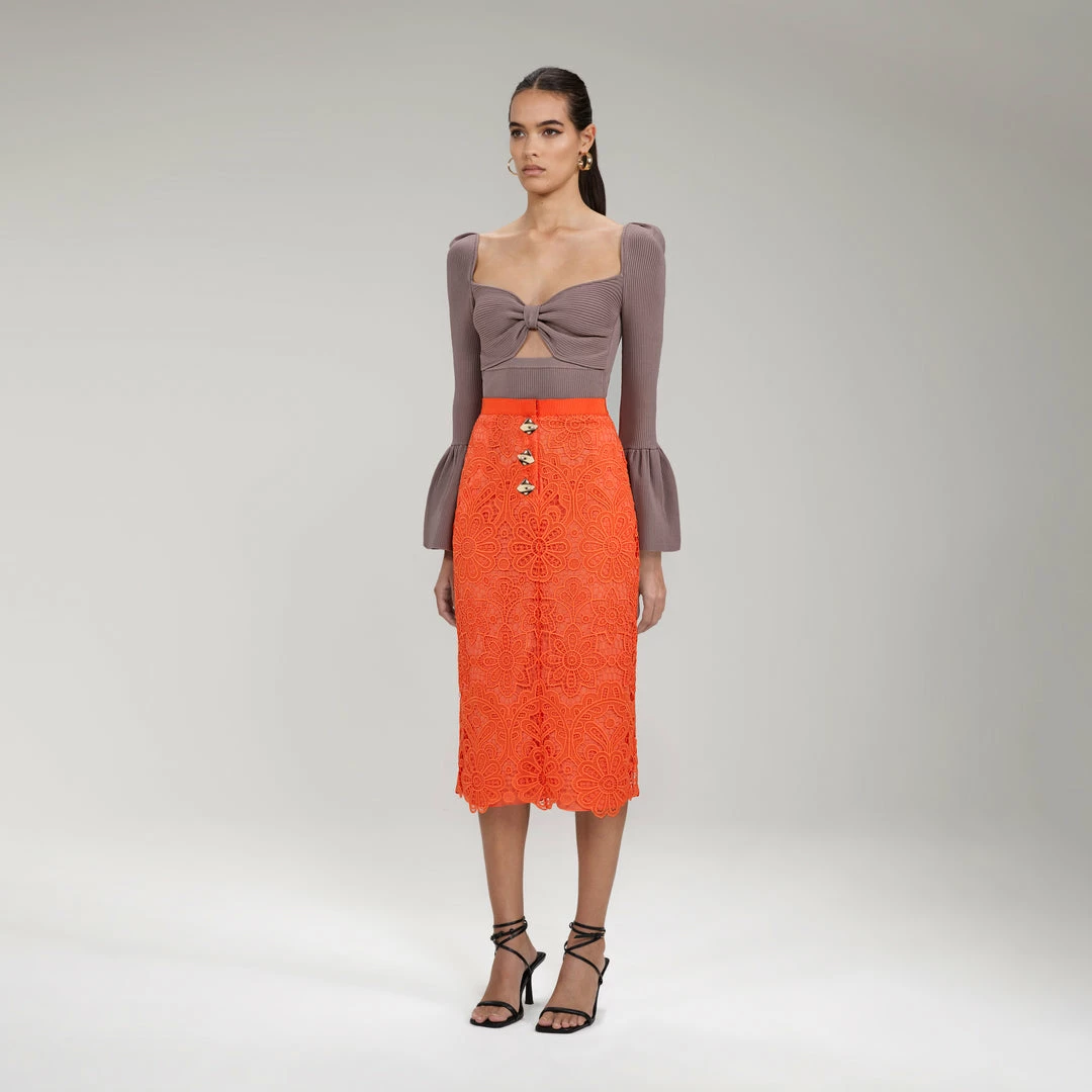 Self-portrait READY TO WEAR Orange Floral Guipure Midi Skirt