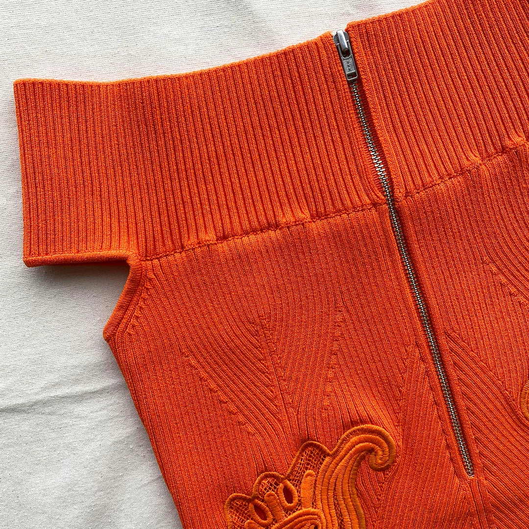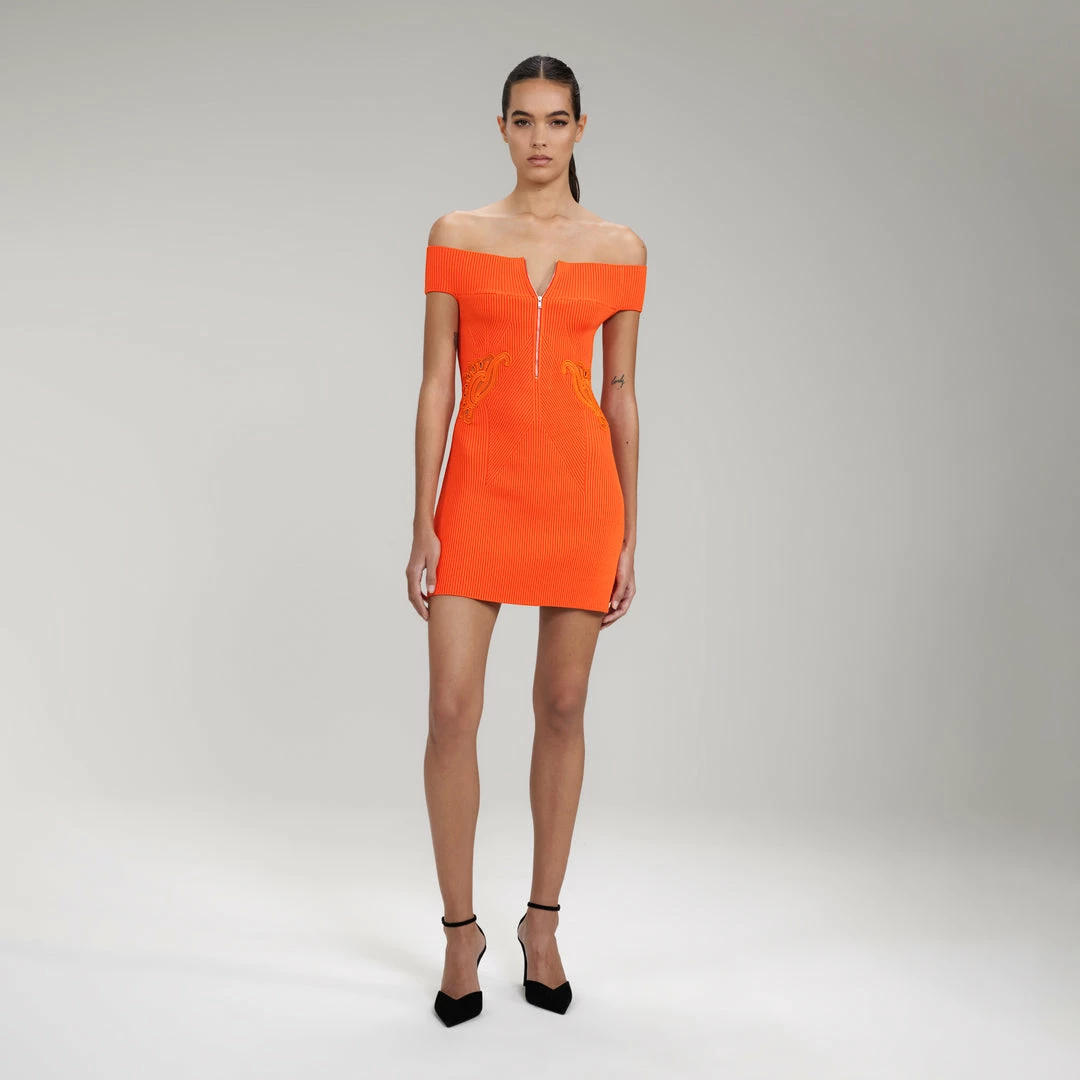 A fresh take on a party-ready silhouette, this striking orange mini dress is made in stretch ribbed viscose for a sculpting silhouette. A zip-embellished off-shoulder neckline offers a cool glint of hardware and will spotlight your shoulders while lace panelling on the bodice frames your curves. Add nude heels to further elongate your legs. Check the Size Guide to find your perfect fit.