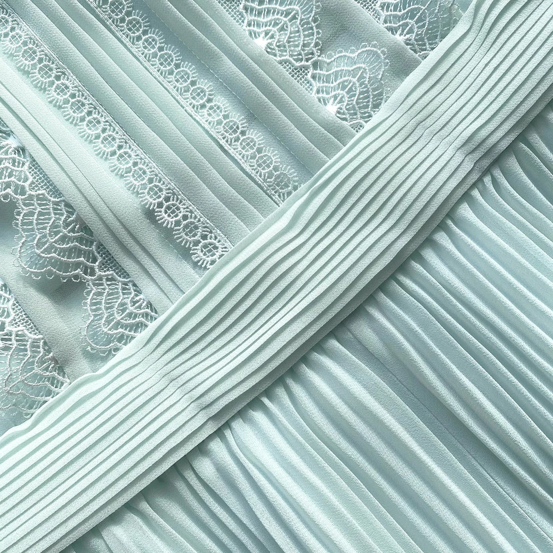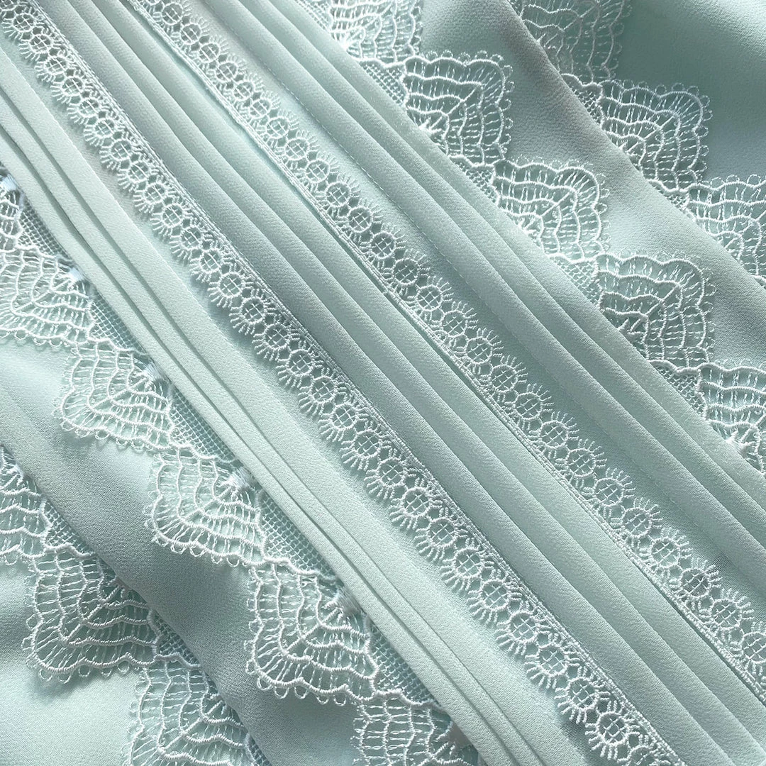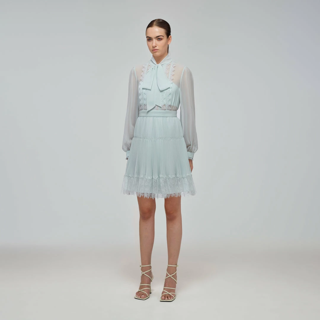 This fit and flare mini dress is cut from pale green chiffon. The style is designed with a flattering pussy bow and features tonal lace trims throughout. Check the Size Guide to find your perfect fit.