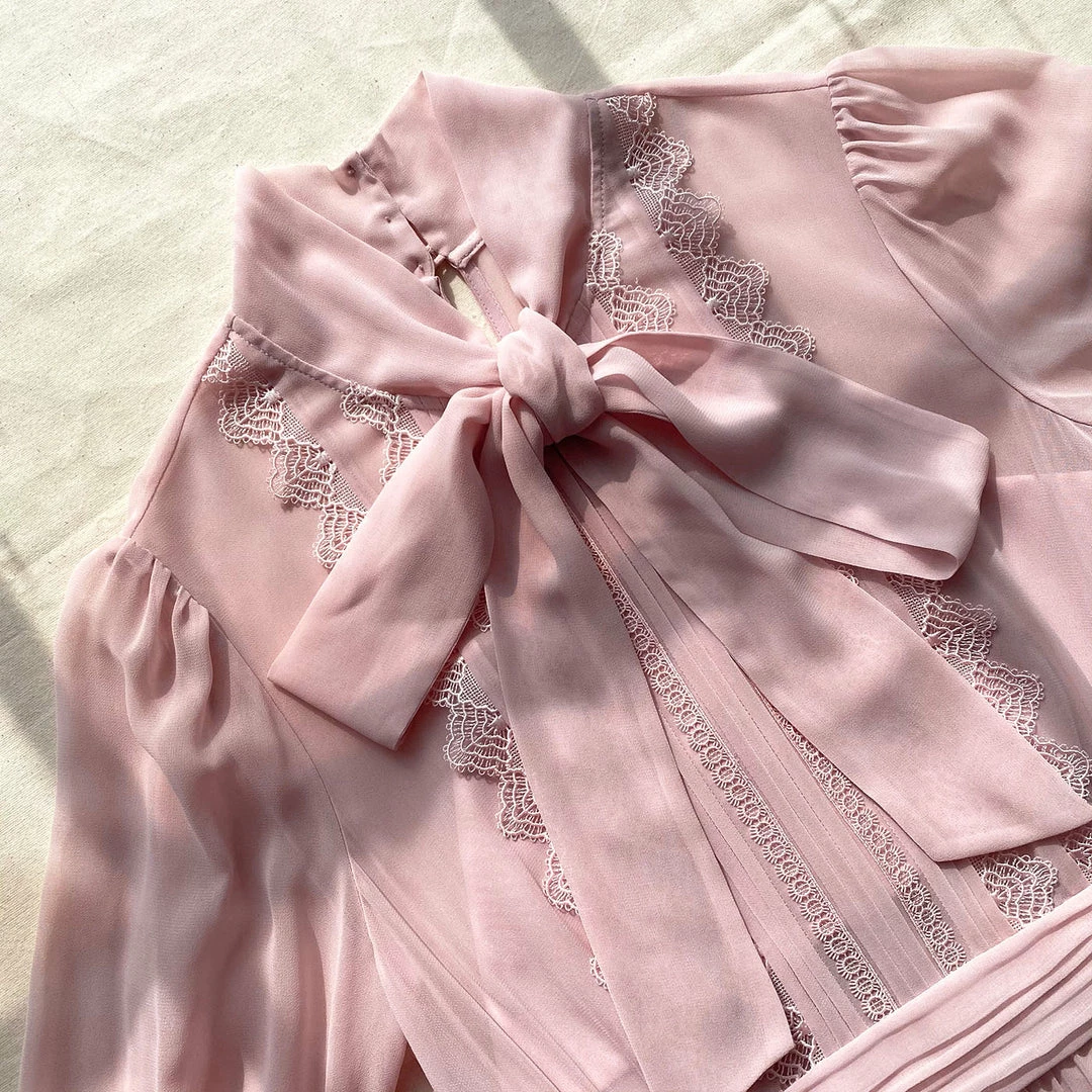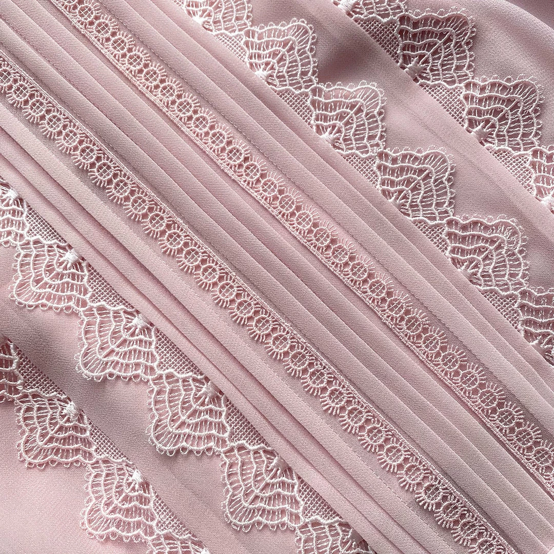 This fit and flare midi dress is cut from pale pink chiffon. The style is designed with a flattering pussy bow and features tonal lace trims throughout. Check the Size Guide to find your perfect fit.