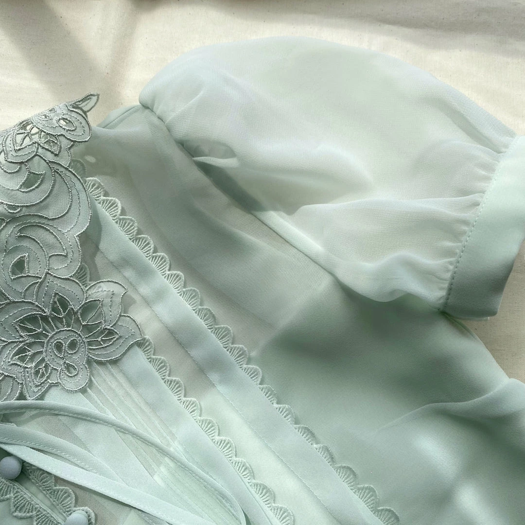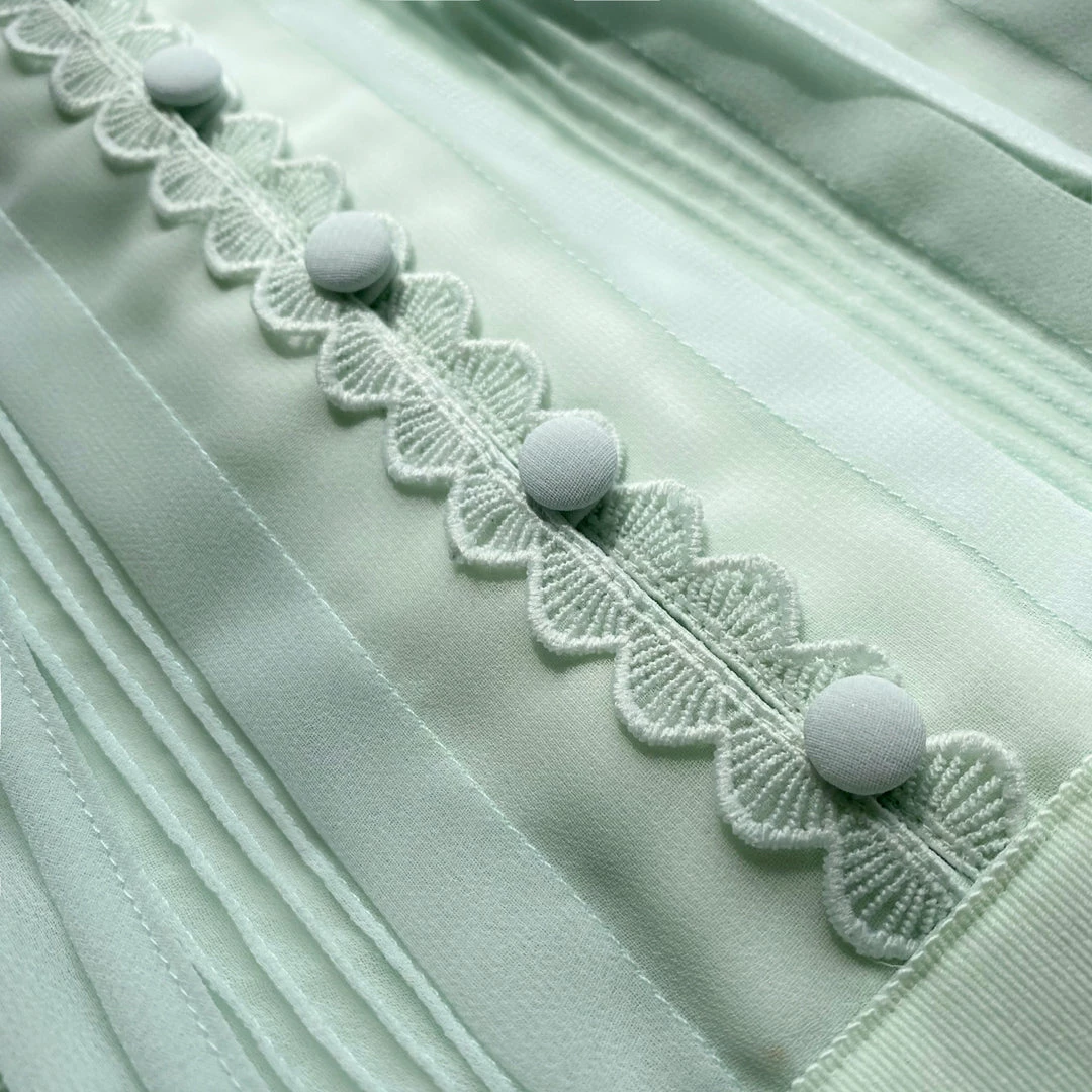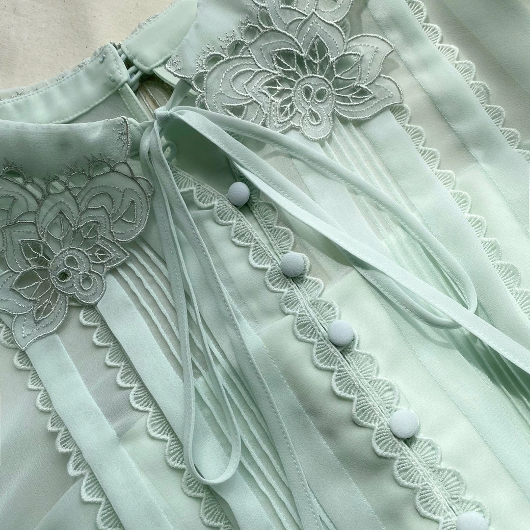 This mini dress is cut from pastel jade chiffon. It is designed with a delicate embroidered collar, puff sleeves and lace trims through the bodice. This style is fitted at the waist and falls to a pleated mini skirt. Check the Size Guide to find your perfect fit.