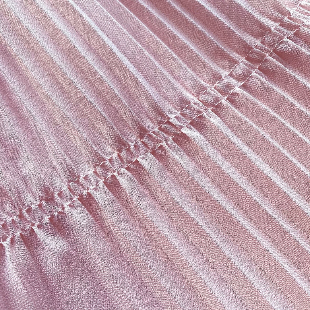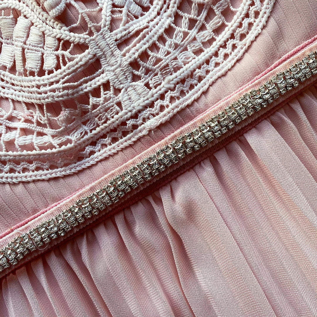This midi dress is cut from dusty pink recycled polyester. It is designed with a macramé trim on the bodice and a tonal neck tie. It is fitted at the waist with a removable diamanté belt and falls to a pleated midi skirt. Check the Size Guide to find your perfect fit.