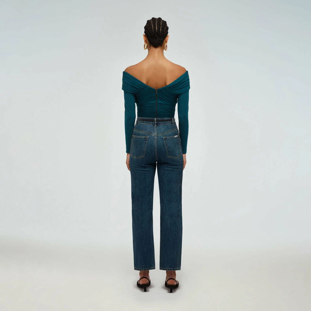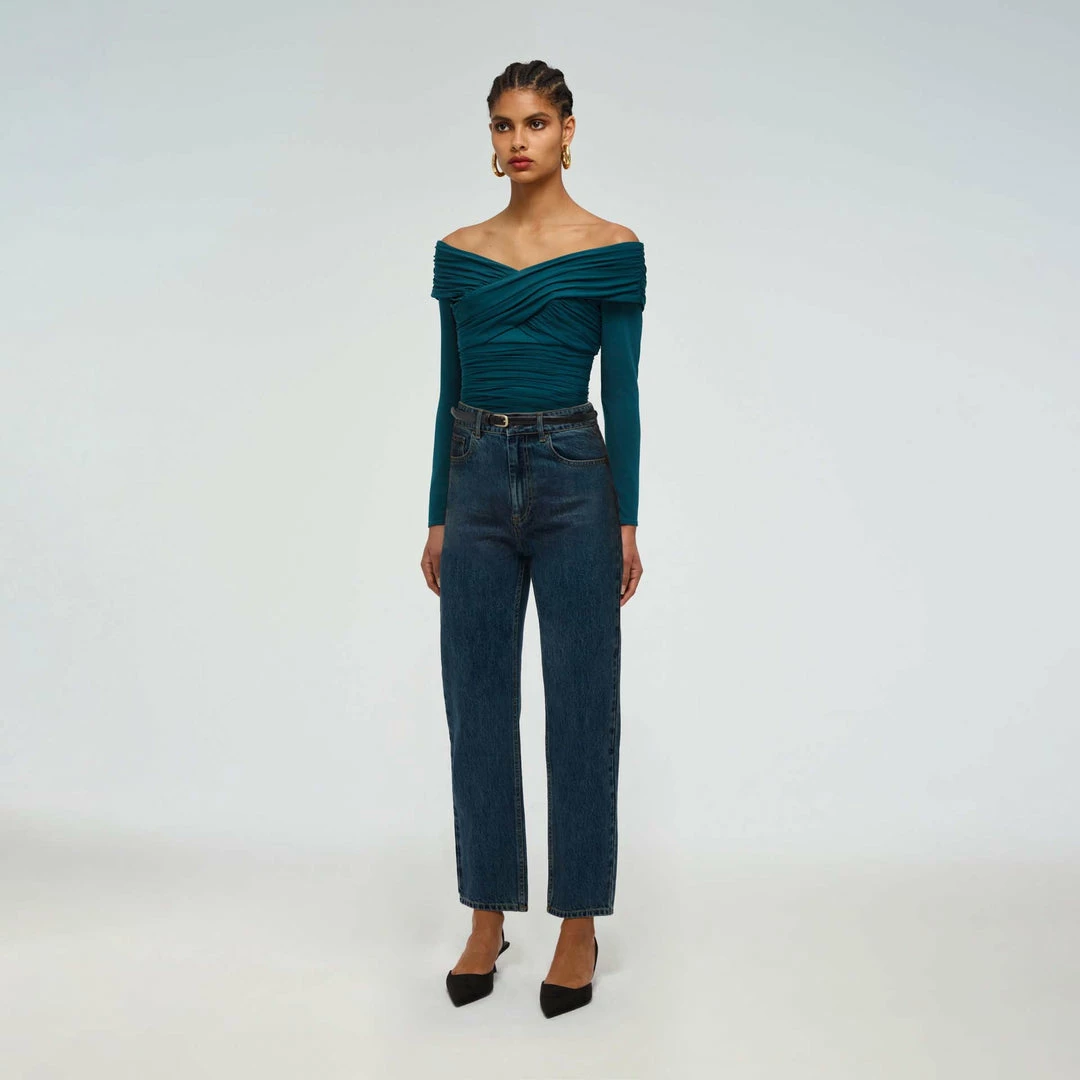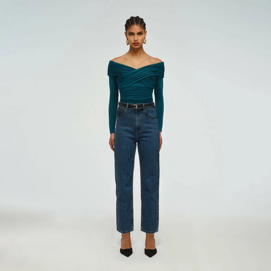 This teal jersey top features a flattering off shoulder design and a wrap bust detail. It is fitted through the waist with ruching through the body. Check the Size Guide to find your perfect fit.