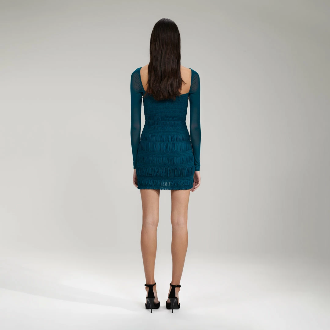 Self-portrait READY TO WEAR Teal Shirred Powermesh Mini Dress