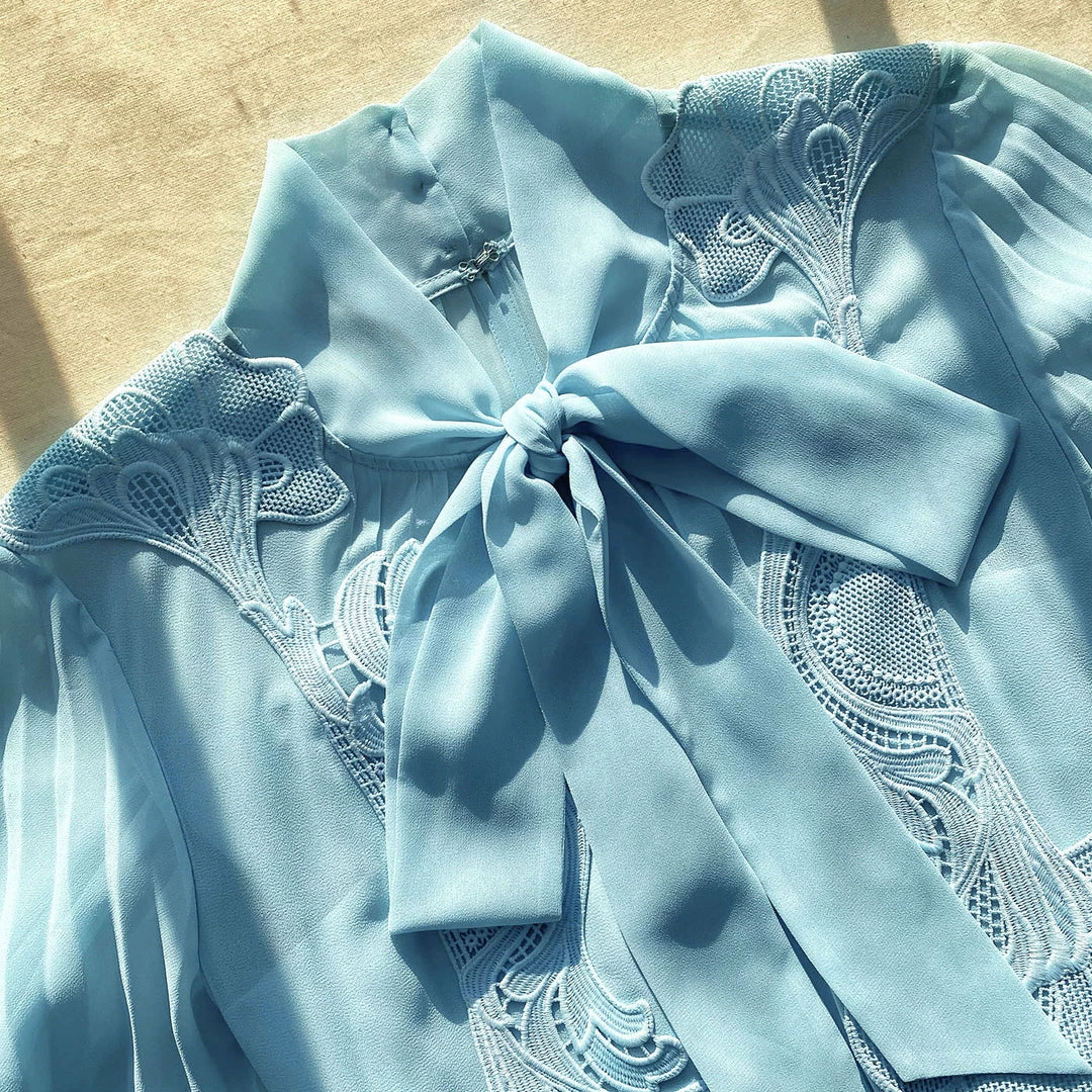 This maxi dress is cut with from dusky blue recycled chiffon and tonal lace trims. It is designed with a statement pussy bow detail and a cape back. It is fitted at the waist with a fabric belt and falls to a pleated maxi skirt. This style is lined. Check the Size Guide to find your perfect fit.