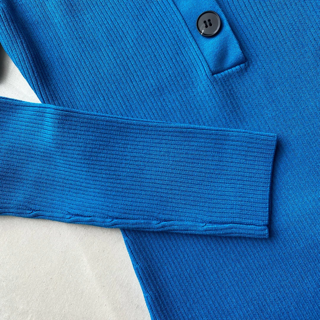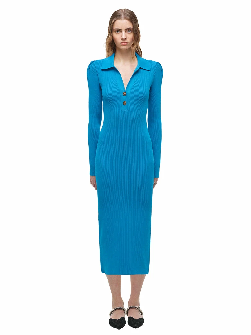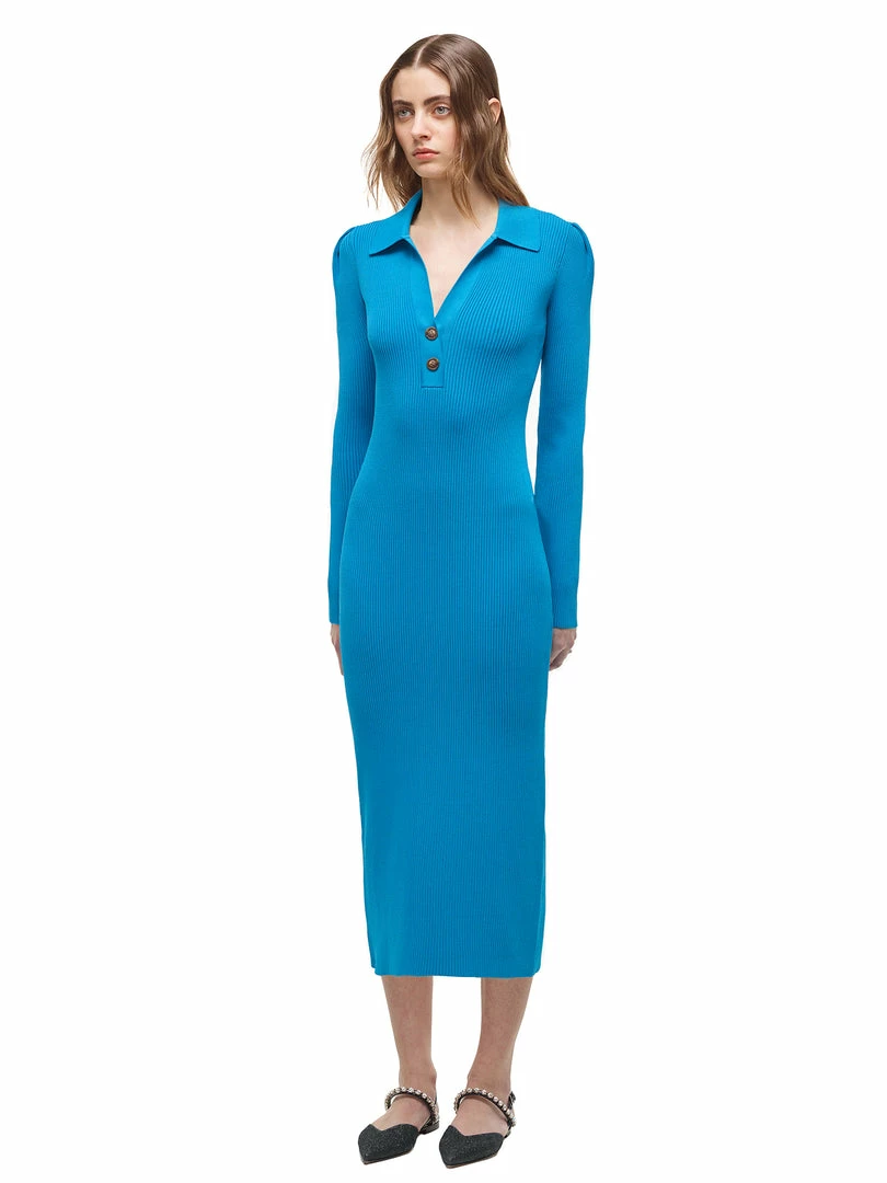 This ribbed knit midi dress is designed with an open neck button detail collar. The skirt is fitted through the body for a sculpted silhouette. Check the Size Guide to find your perfect fit.
