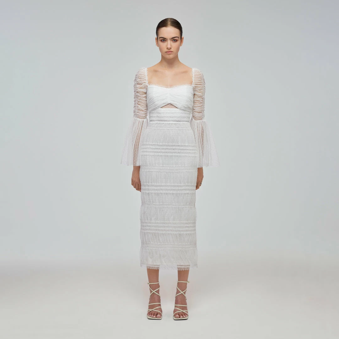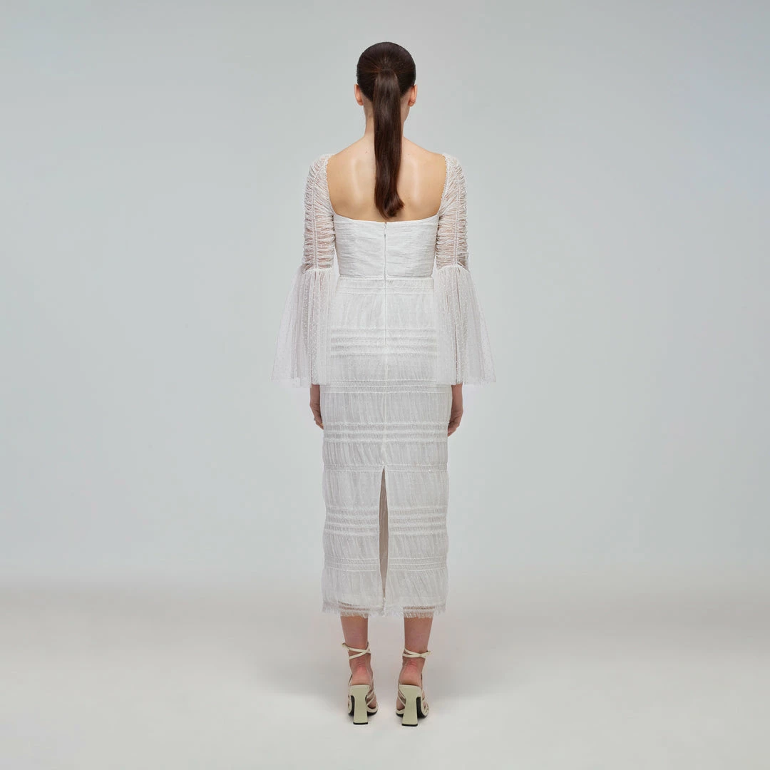 Self-portrait READY TO WEAR White Shirred Dot Mesh Midi Dress