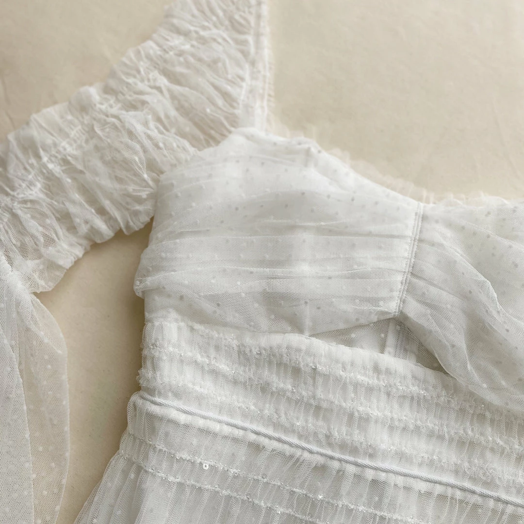 This midi dress is cut from white shirred dot mesh. It is designed with a flattering sweetheart neckline and gathering through the bust. It is cut with a flattering fitted silhouette and falls to a midi length. Check the Size Guide to find your perfect fit.