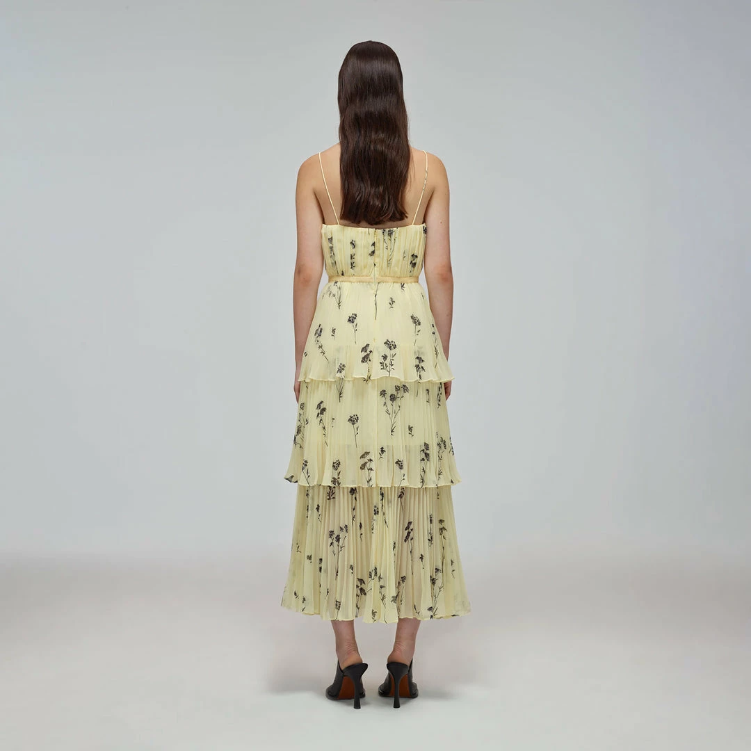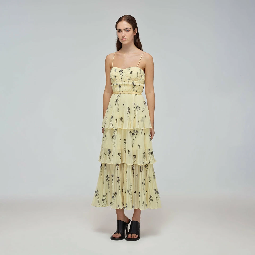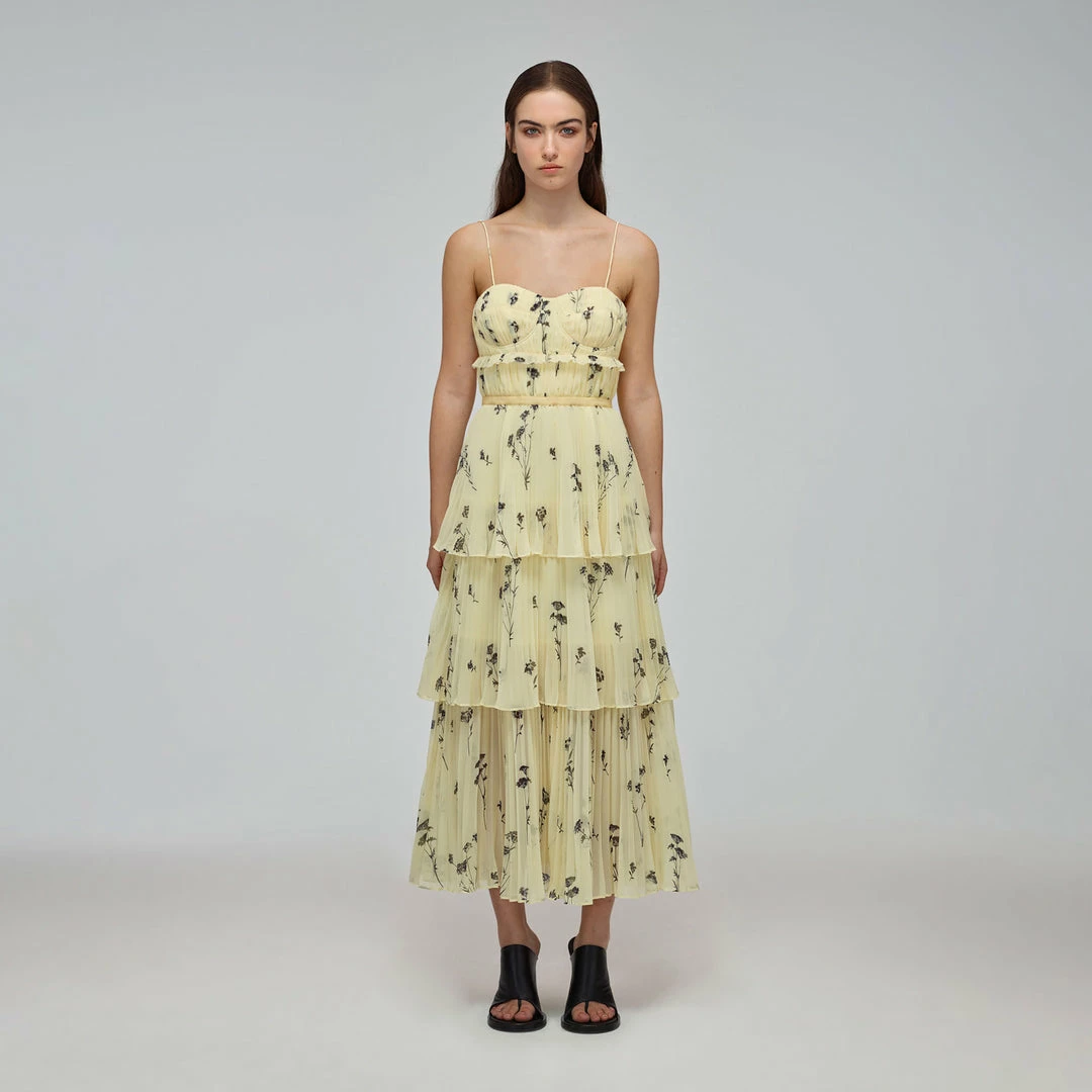 Self-portrait READY TO WEAR Yellow Floral Silhouette Chiffon Tiered Midi Dress