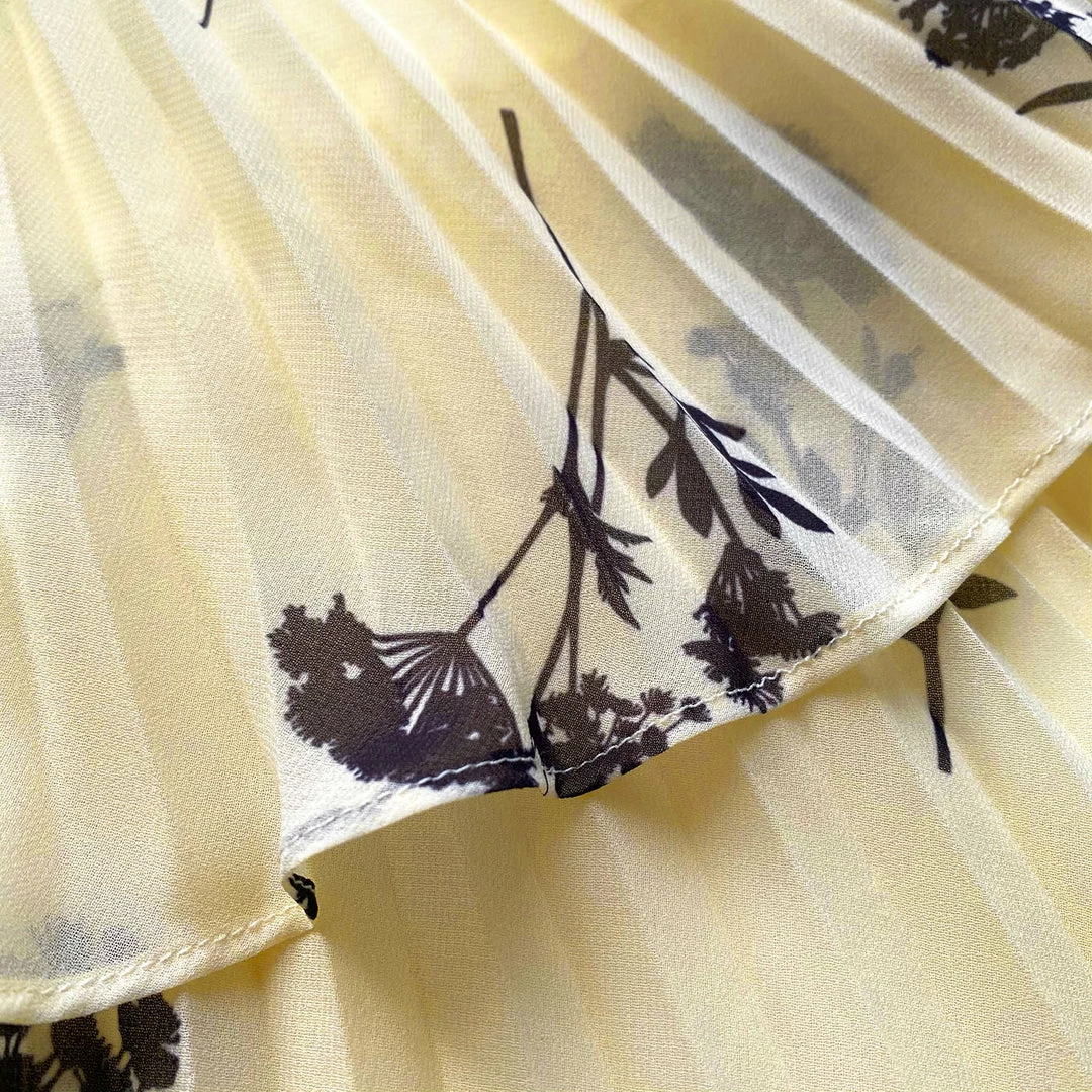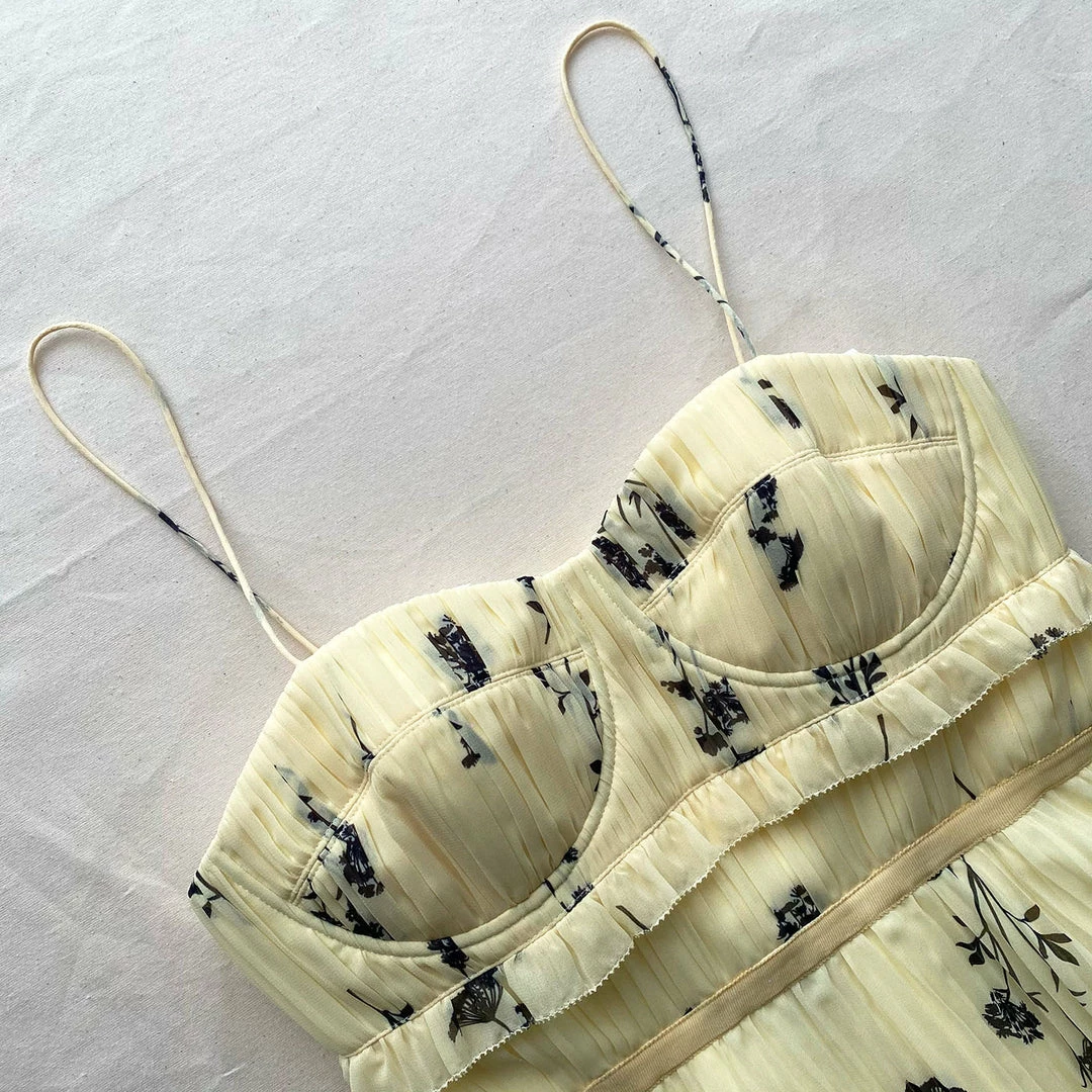 This midi dress is cut from yellow floral silhouette print chiffon. It is designed with a flattering neckline and spaghetti straps. The bodice is gathered and the bust cups have underwire for extra support. It is fitted at the waist and falls to a pleated tiered midi skirt. Check the Size Guide to find your perfect fit.
