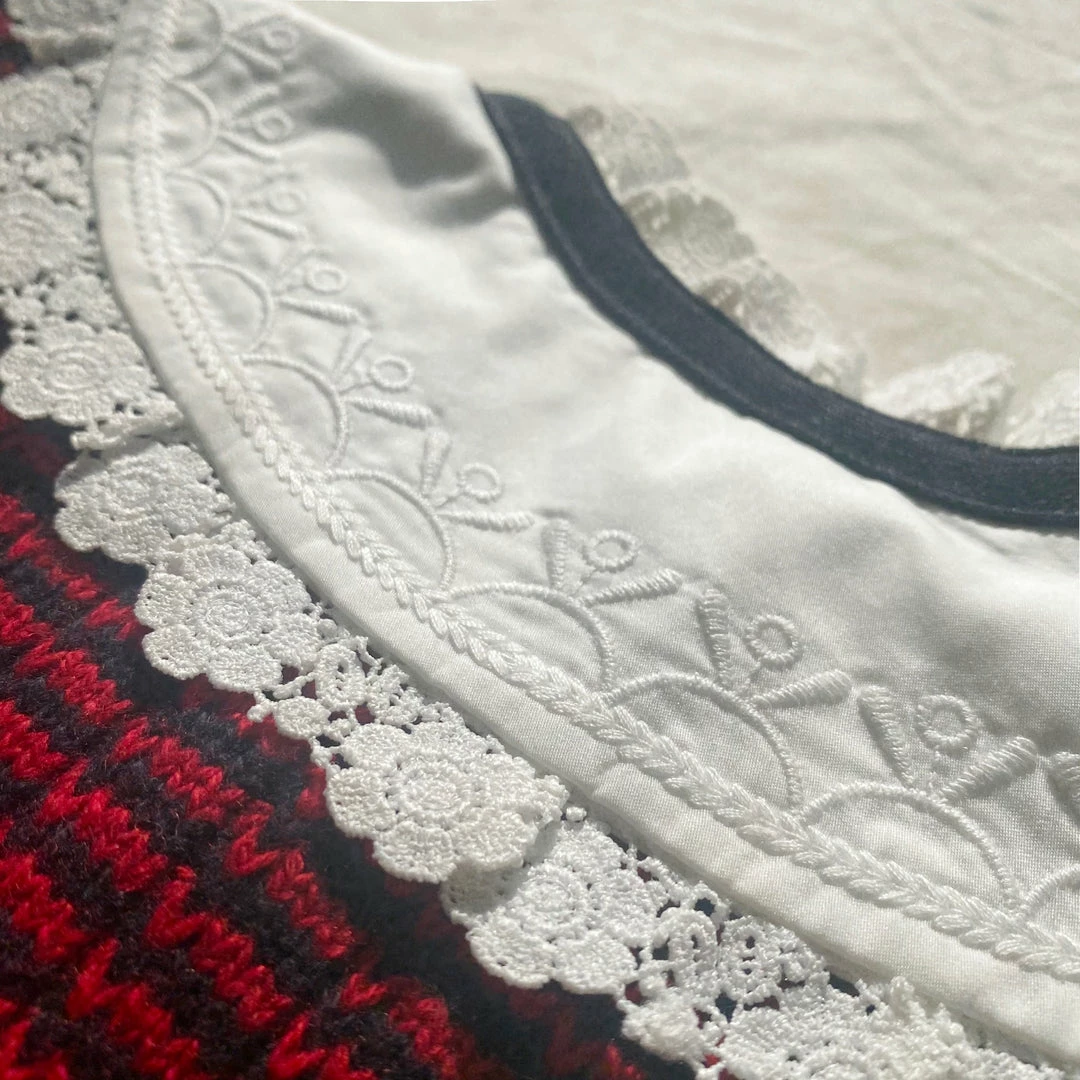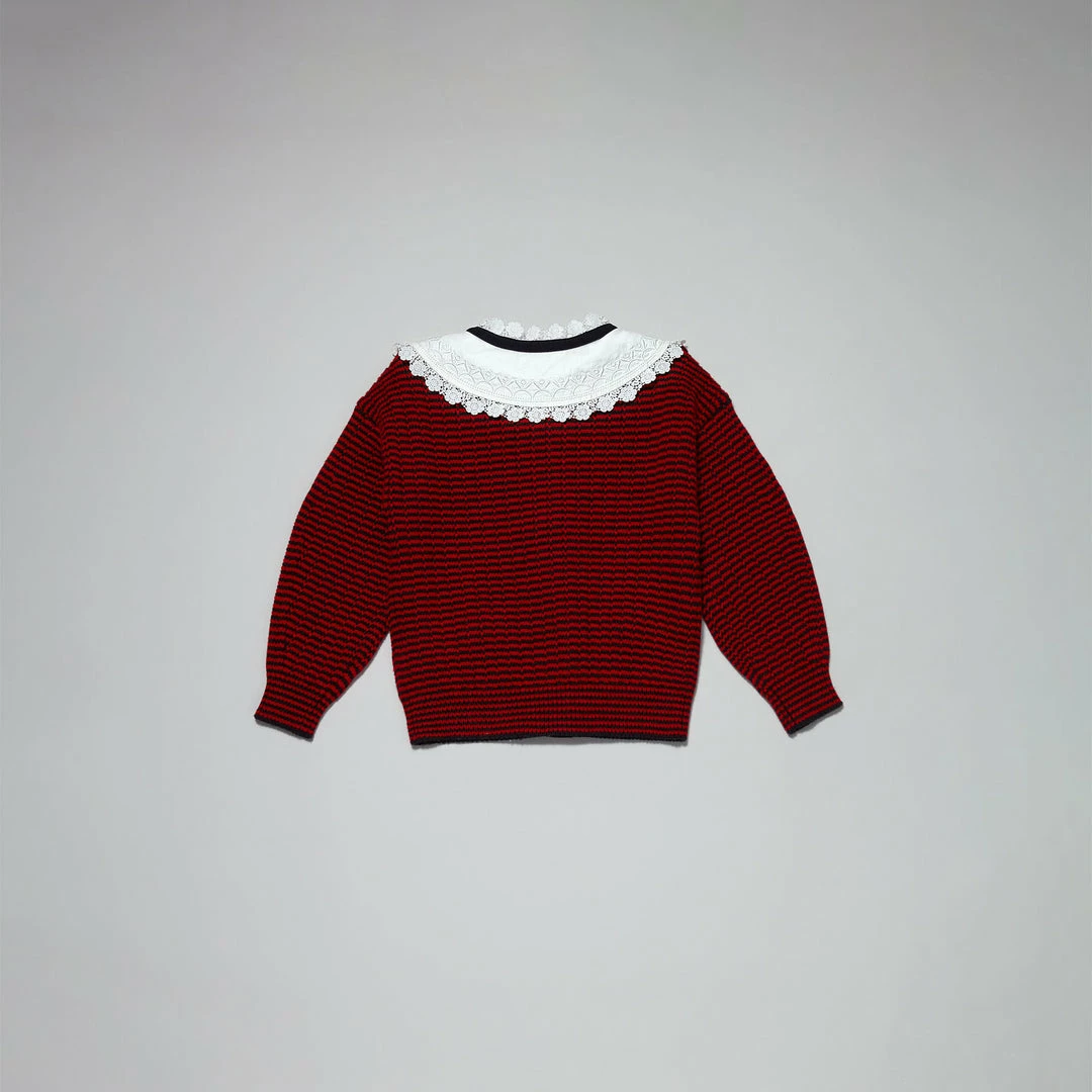 This kids red and navy melange cardigan is designed with a crew neckline finished with a peterpan collar, lace trims and fastens at the front with diamante buttons. Check the Size Guide to find your perfect fit.