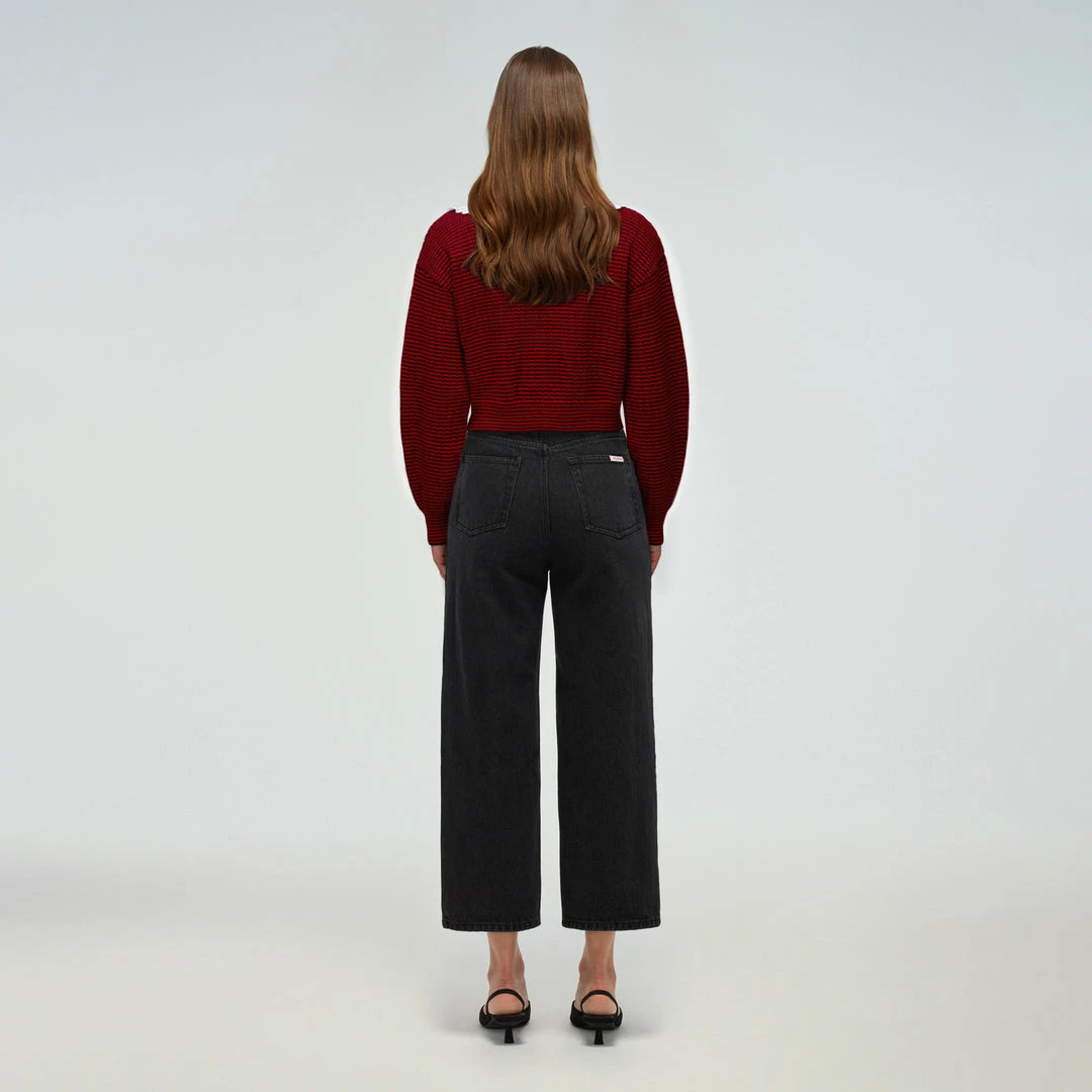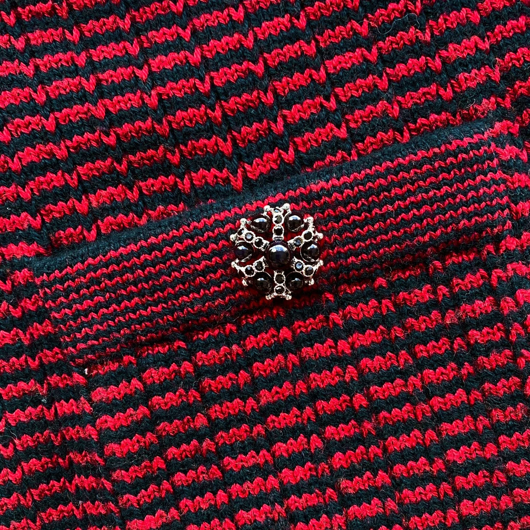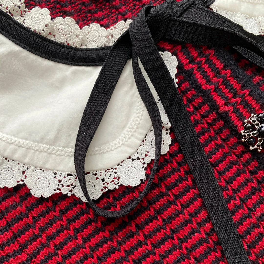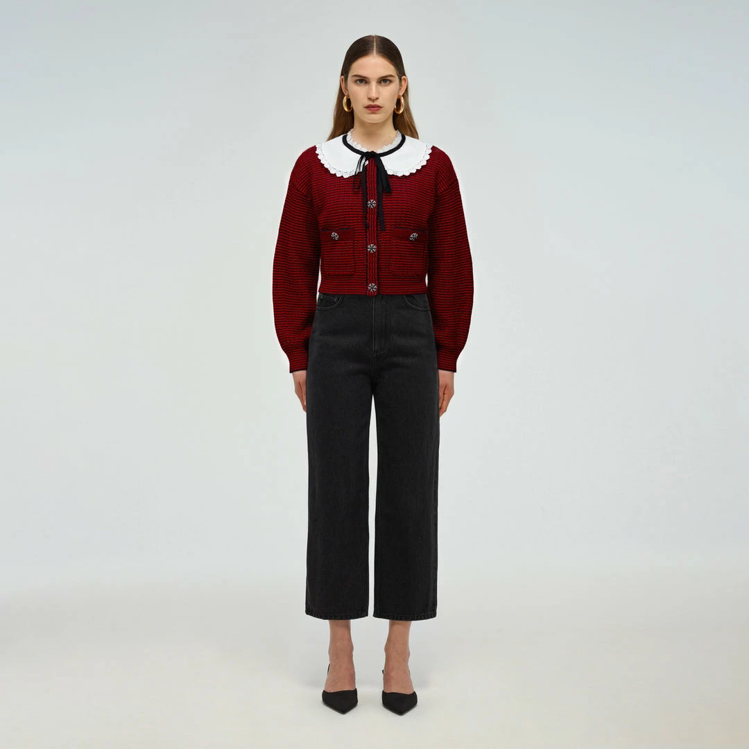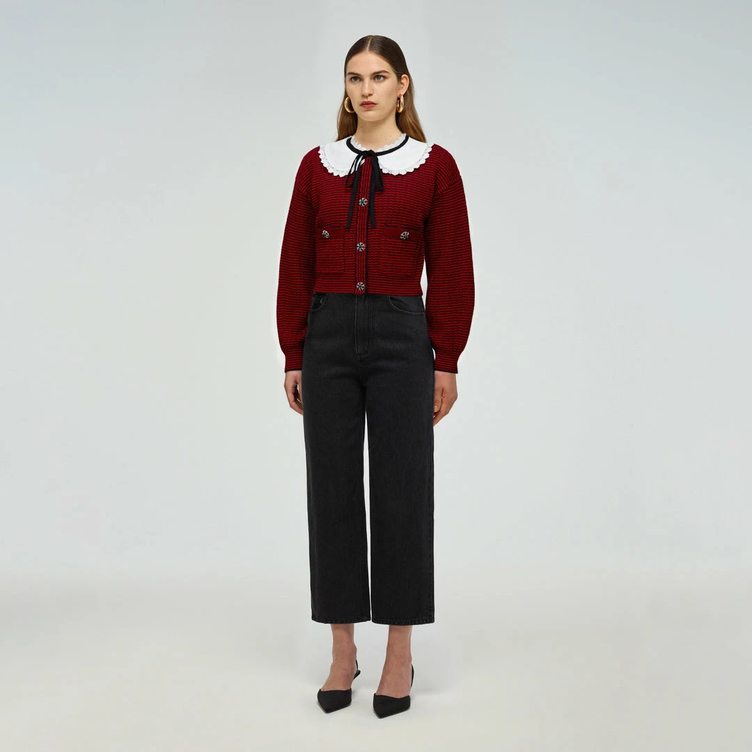 This red and navy stripe knit cardigan is designed with a cotton and lace collar and contrast neck tie. It features diamanté buttons and patch pockets. Check the Size Guide to find your perfect fit.