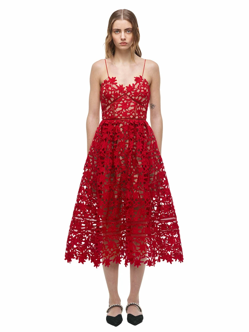 The Azaelea Dress is crafted using textured red lace. The dress features delicate spaghetti straps and the front neckline is framed with a scallop edge. The skirt has a full, pleated silhouette and features a hand-cut, raw lace hemline. The dress fastens neatly at the plunging back with an exposed zip and tan lining. Check the Size Guide to find your perfect fit.