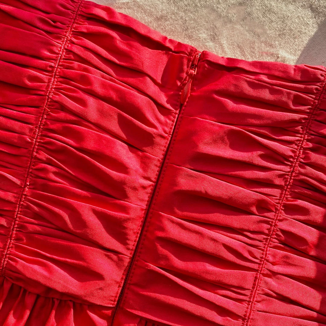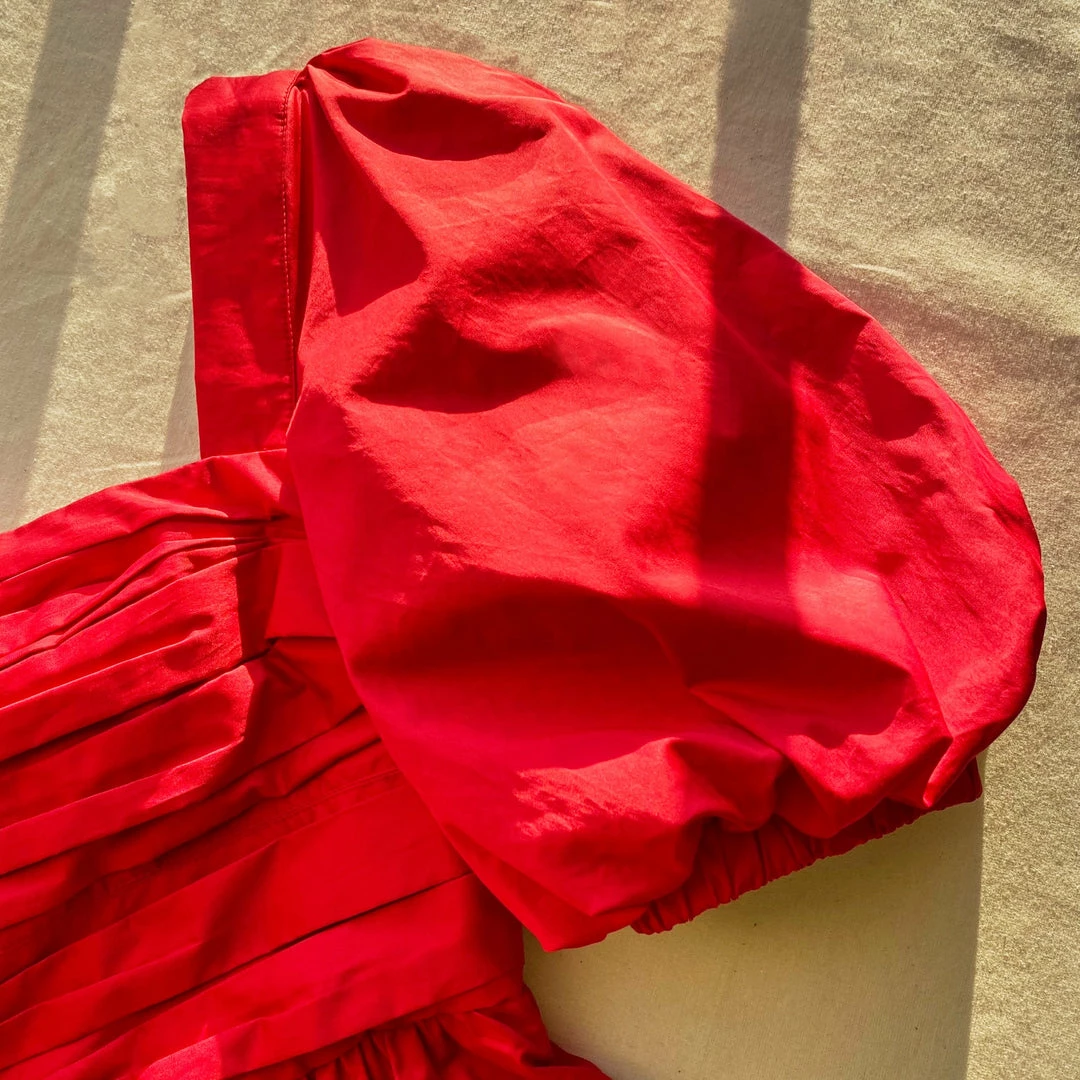 This dress is cut from red taffeta. Designed with a flattering square neckline and statement puff sleeves. Fitted at the waist it falls to a panelled midi skirt. This style is lined with pockets. Check the Size Guide to find your perfect fit.