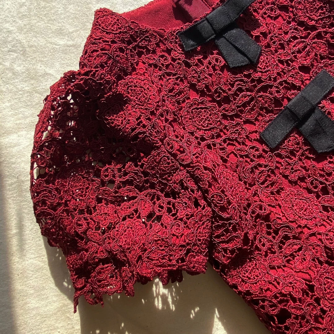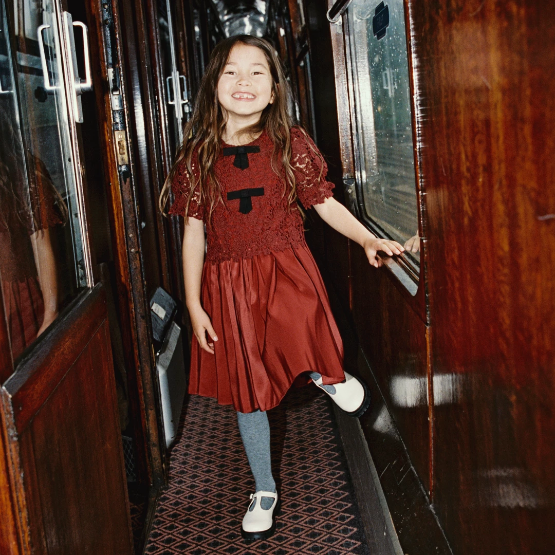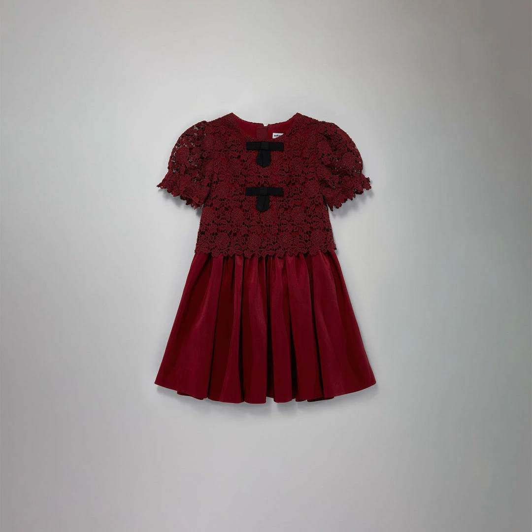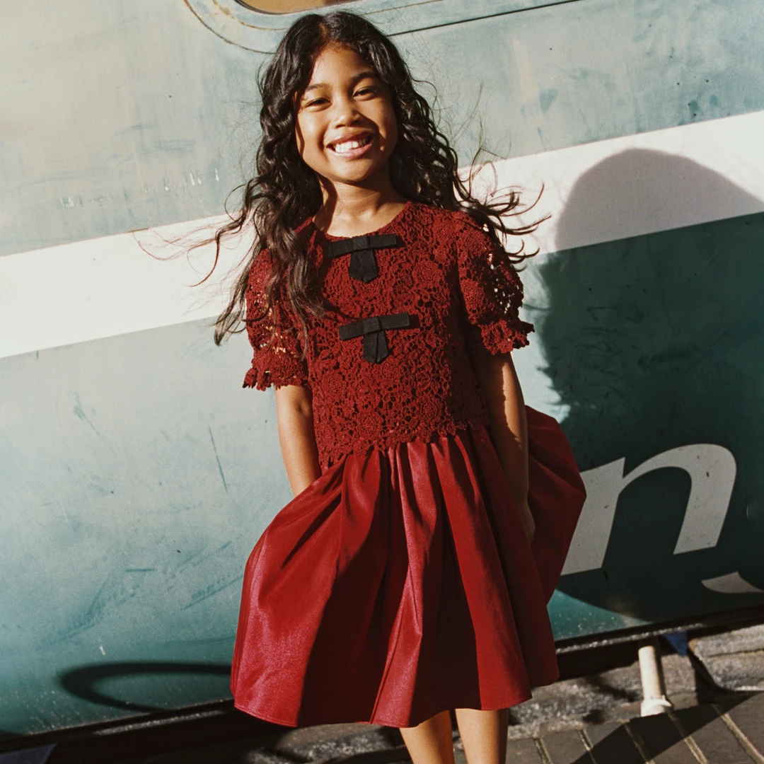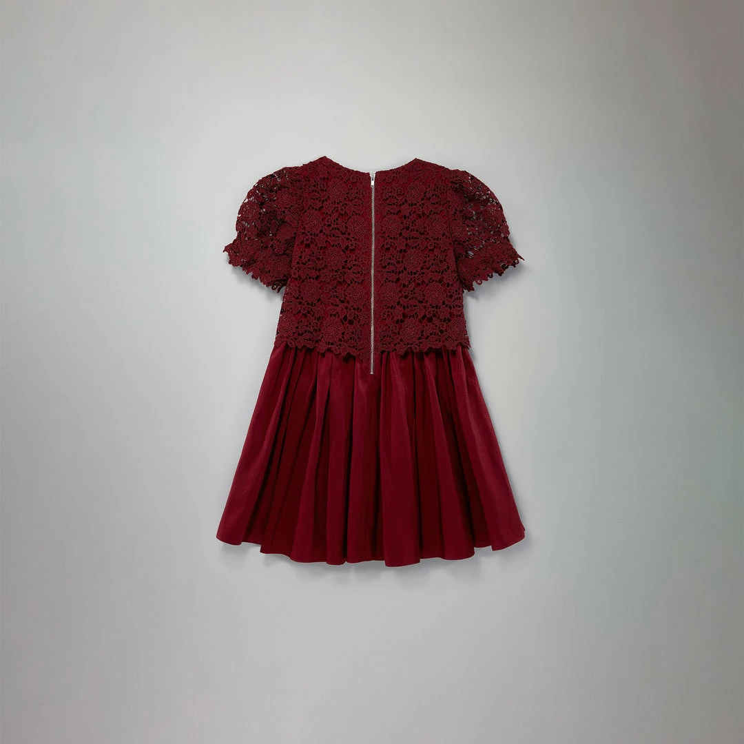 This kids dress is cut from red floral guipure lace and taffeta. It is designed with subtle puff sleeves and a contrast bow trim on the bodice. The pleated skirt falls to a full silhouette. Check the Size Guide to find your perfect fit.