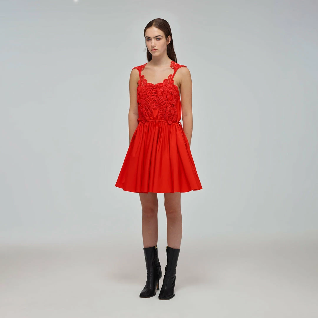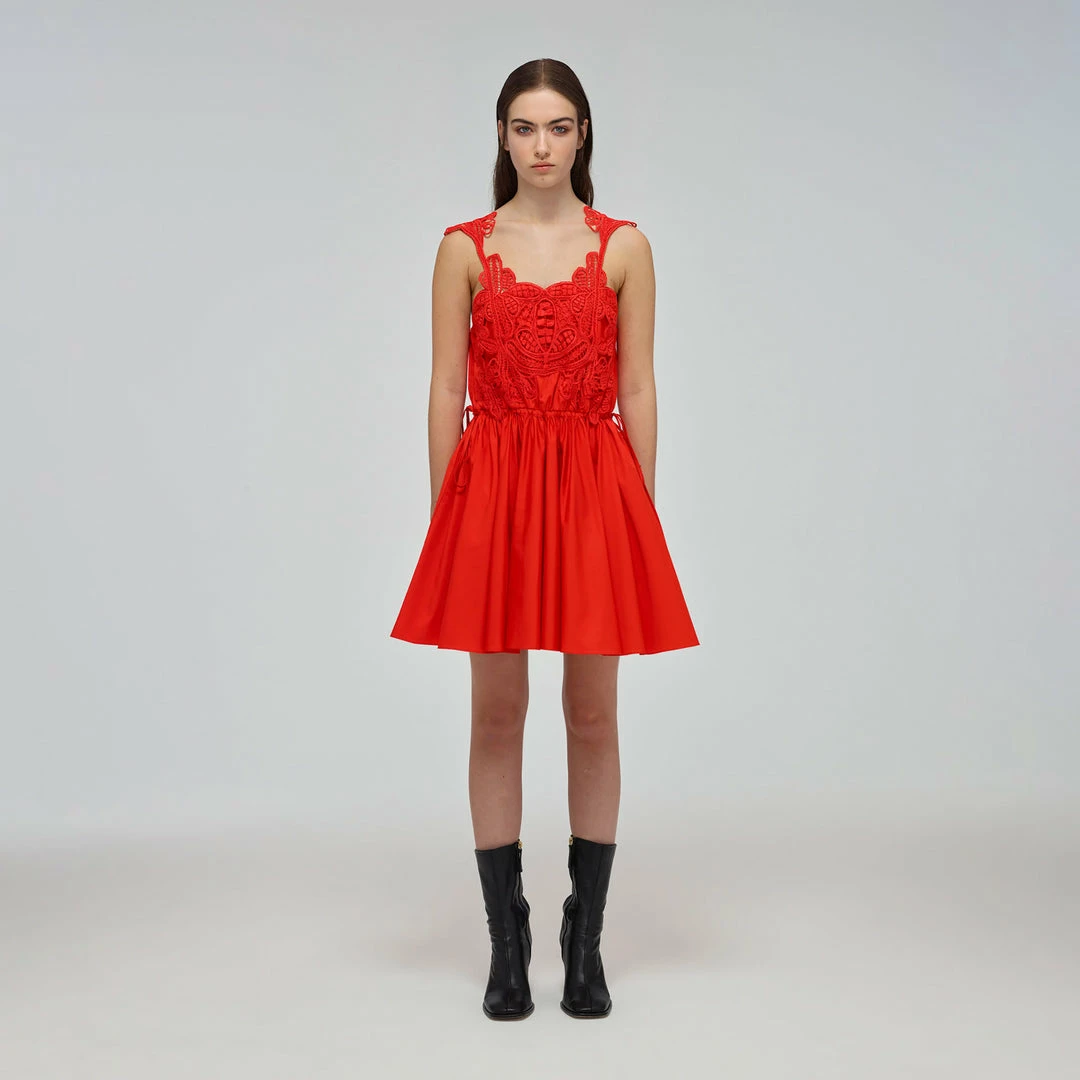 Self-portrait Red Macrame Lace Organic Cotton Mini Dress READY TO WEAR
