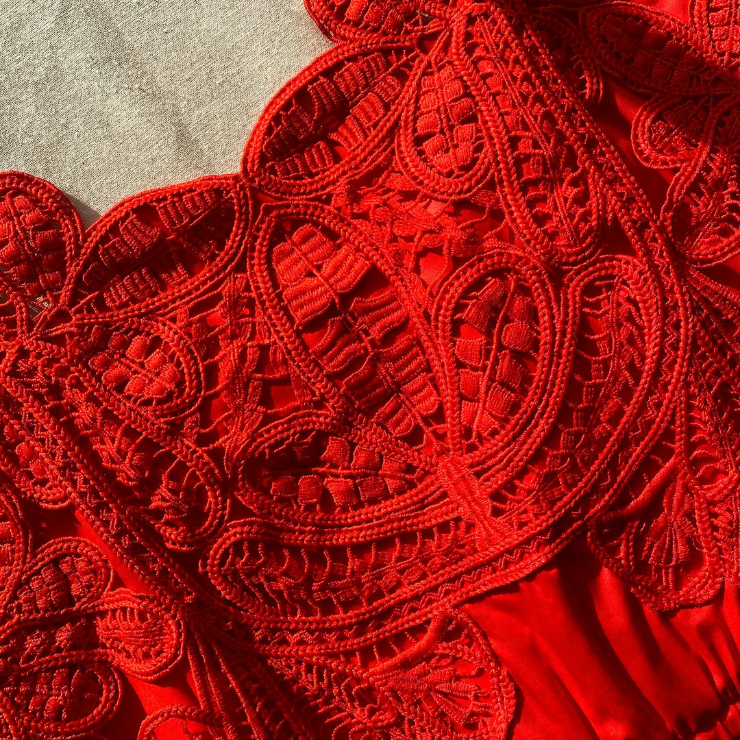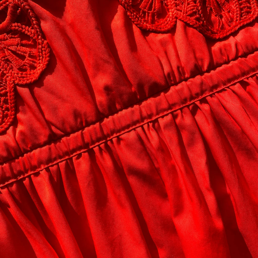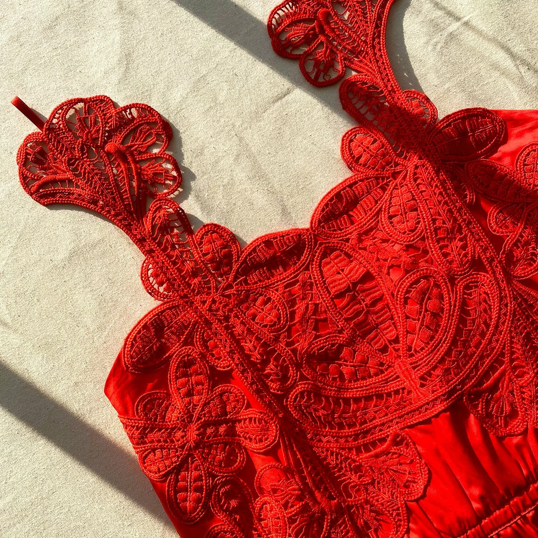 This mini dress is cut from red organic cotton. It is designed with a macramé lace trim at the bodice. It is fitted at the waist with side ties and falls to a gathered mini skirt. Check the Size Guide to find your perfect fit.