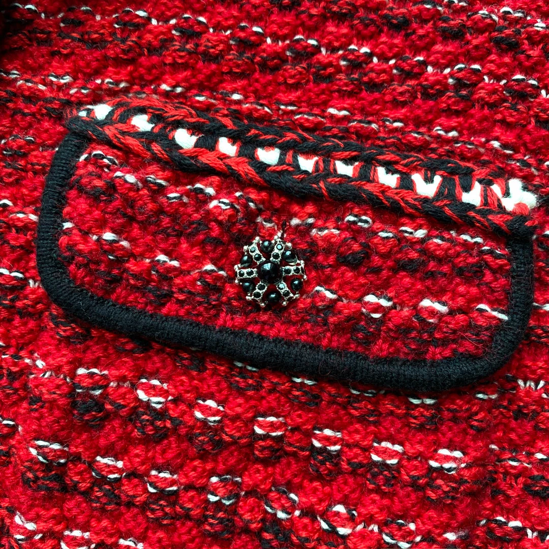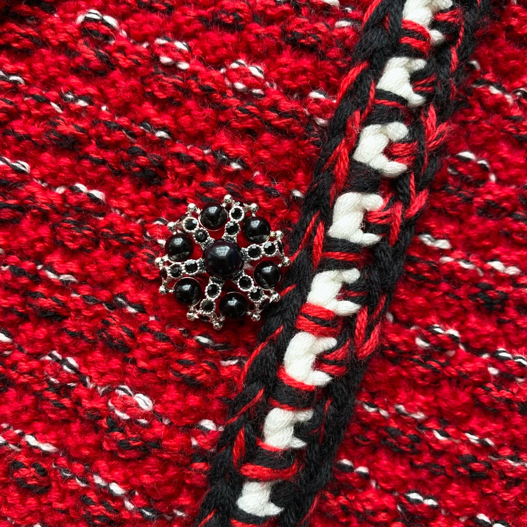 This red melange knit cardigan is designed with a bow at the neck, braided trims and diamante buttons. Check the Size Guide to find your perfect fit.