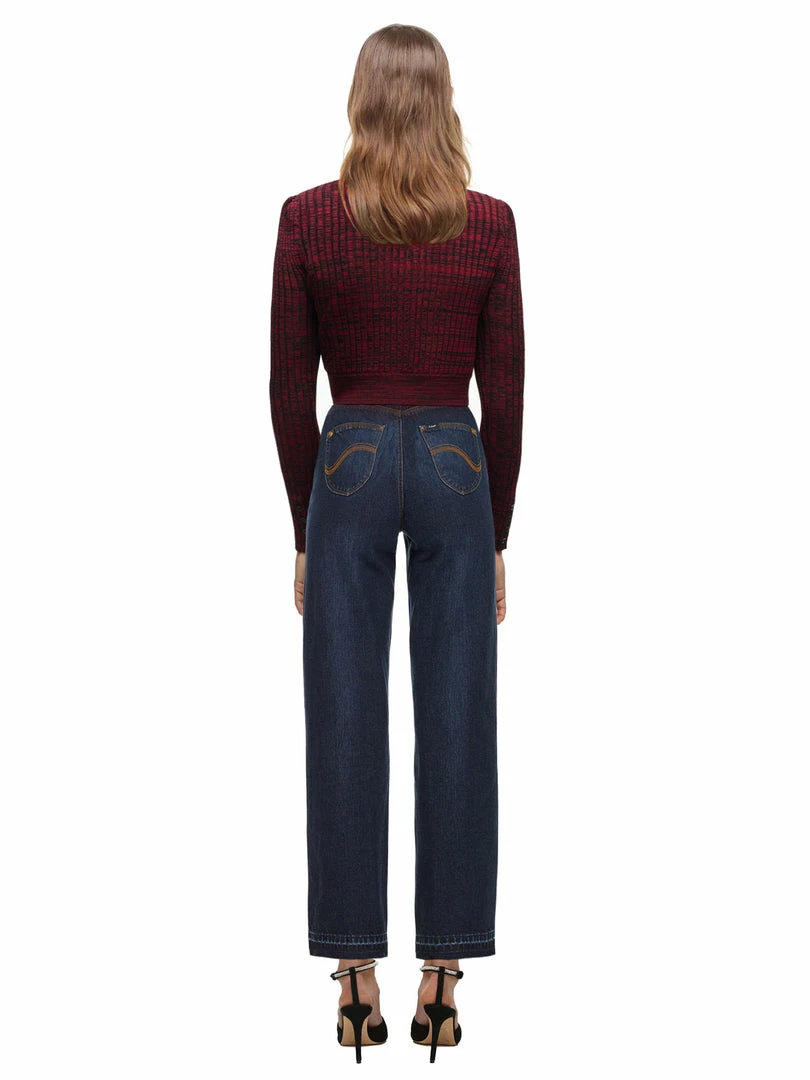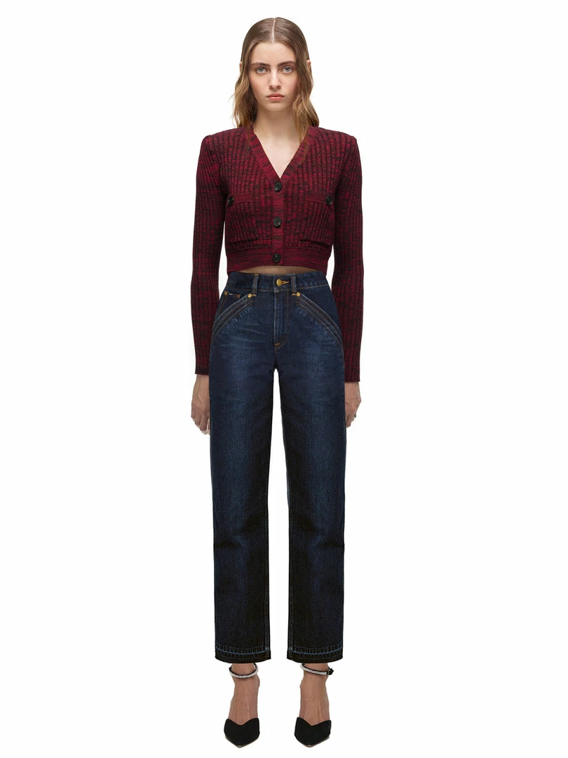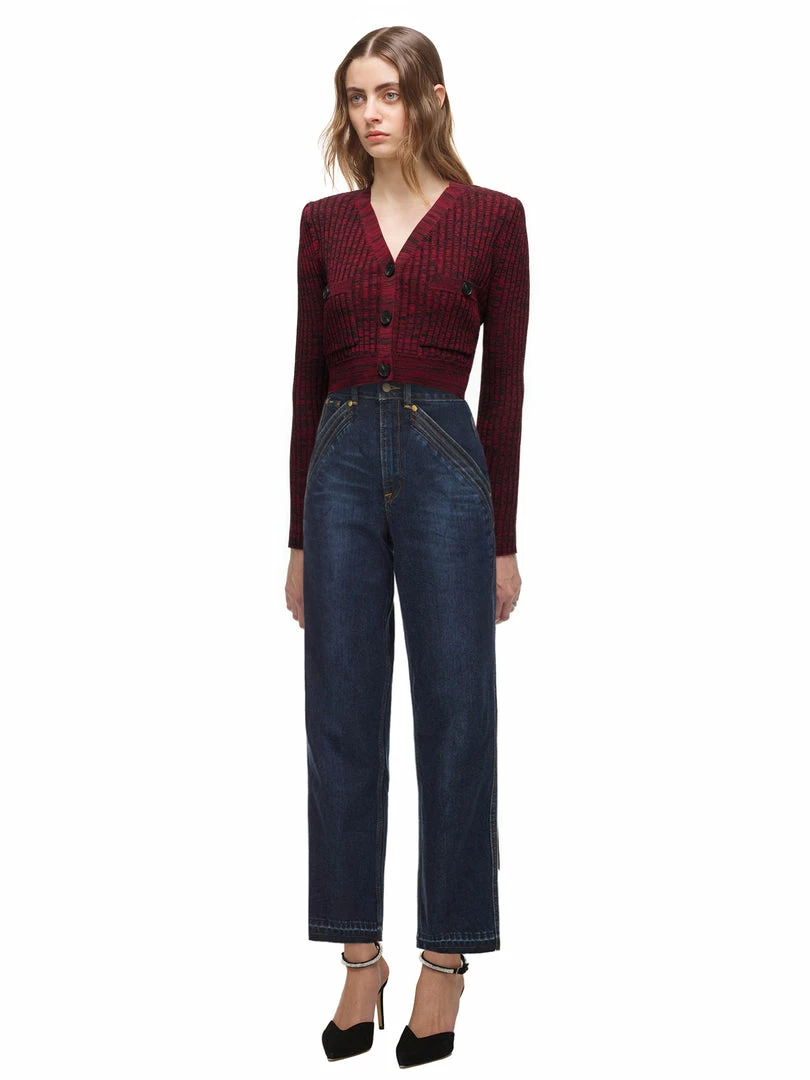 This ribbed space dye knit cardigan is designed with a cropped silhouette. It features removable shoulder pads for a subtle structured form. It is designed with front pockets finished with buttons. Check the Size Guide to find your perfect fit.