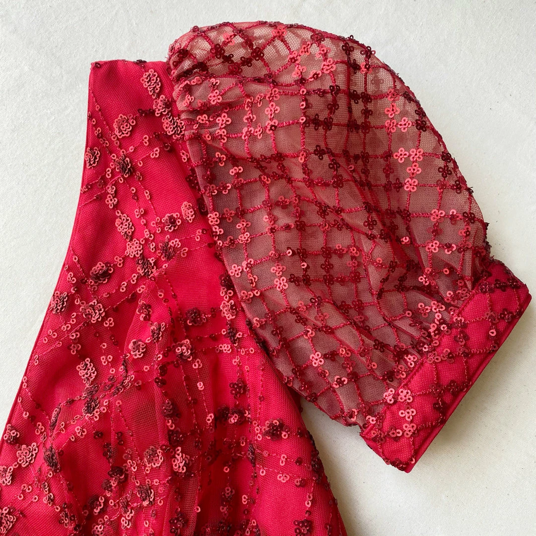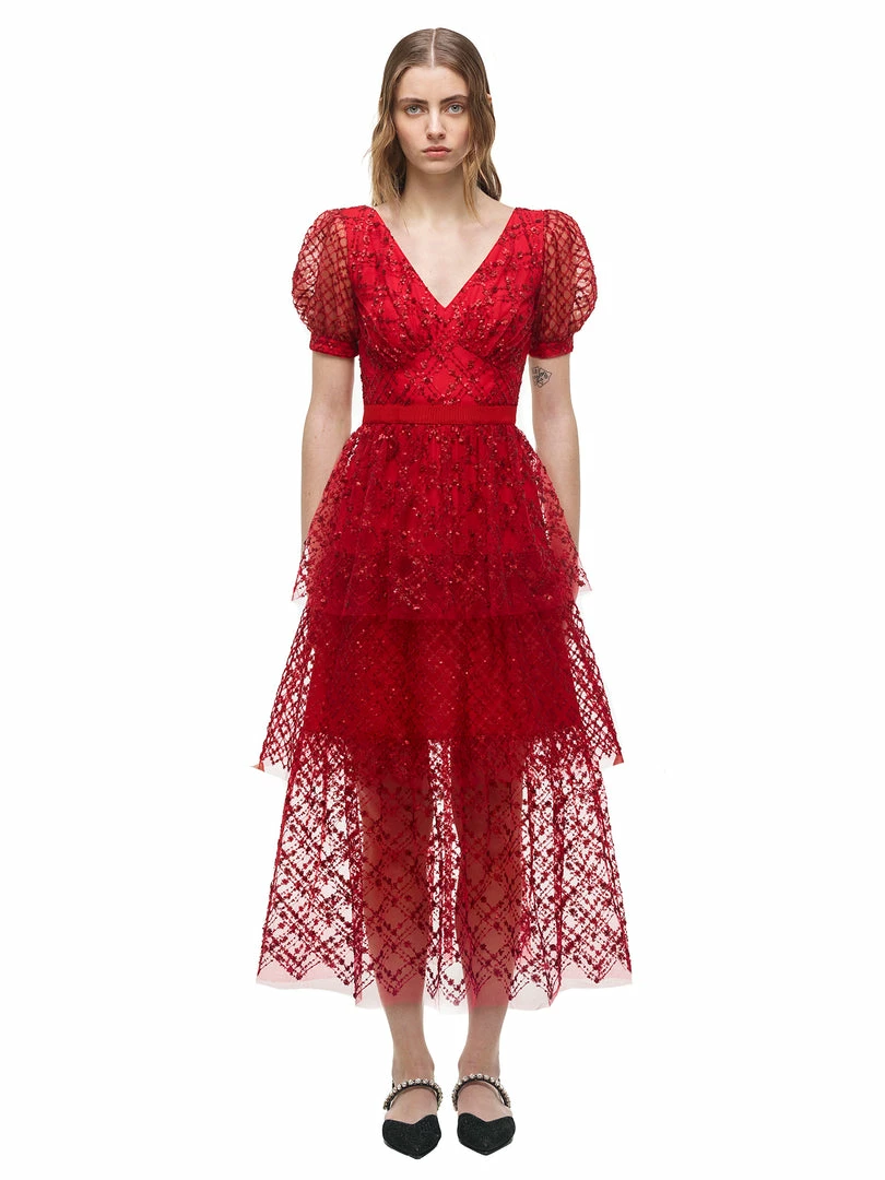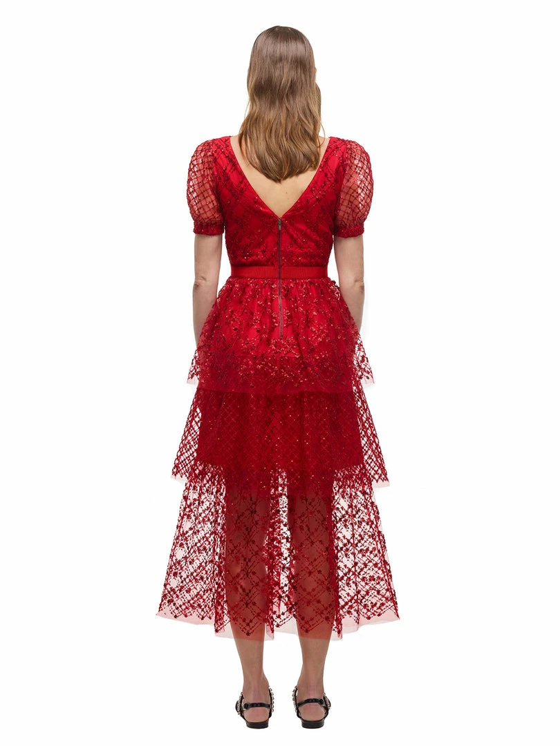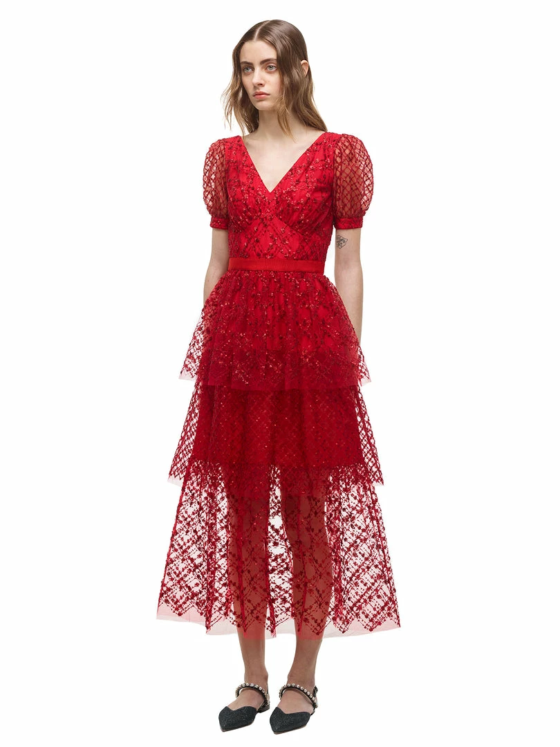 This midi dress is cut from red grid sequin mesh. It is designed with a flattering v neck and subtle puff sleeves. It is fitted at the waist and falls to a tiered midi skirt. This style is lined. Check the Size Guide to find your perfect fit.
