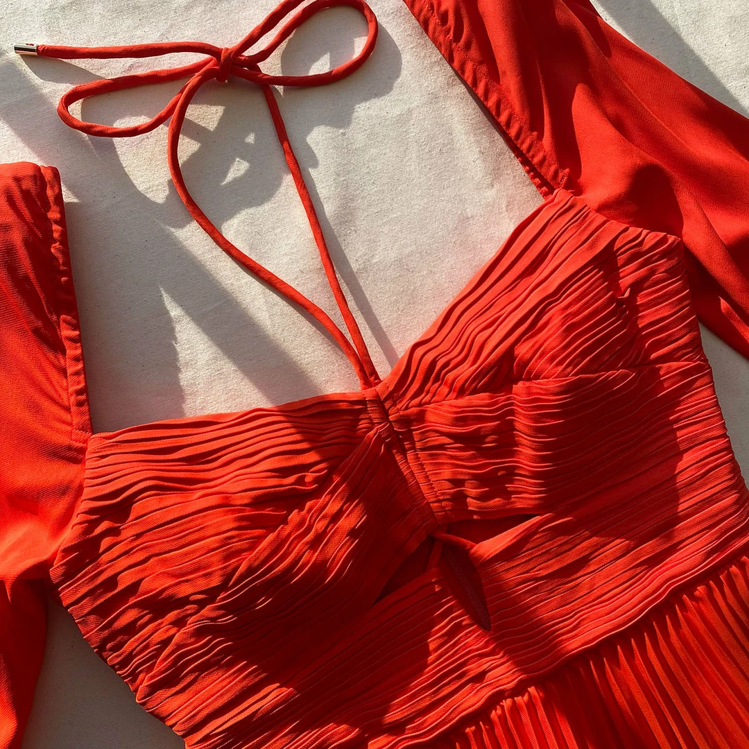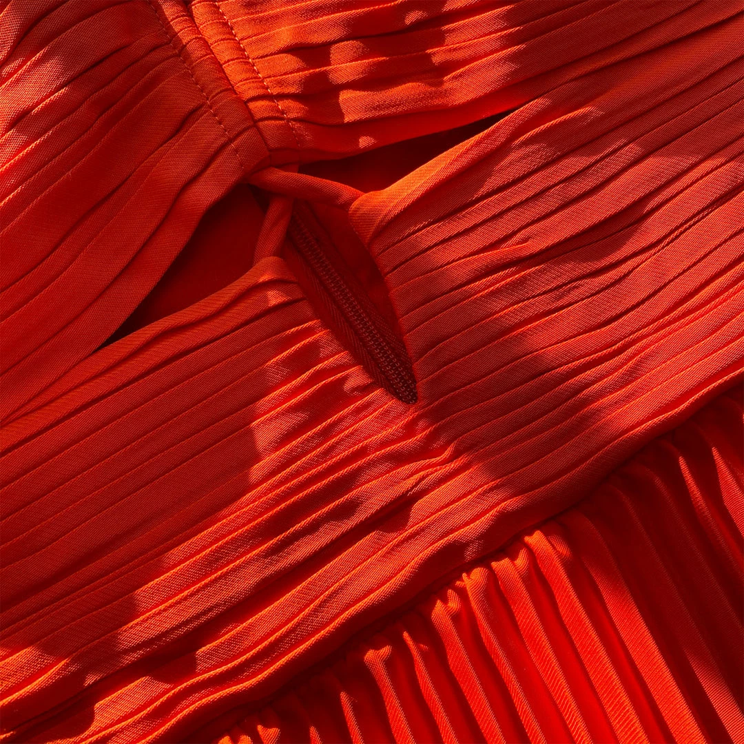 This red midi dress is cut from stretch crepe. It is designed with a halter neck tie and sweetheart neckline. It features a cut out waist design and a full pleated midi skirt. Check the Size Guide to find your perfect fit.