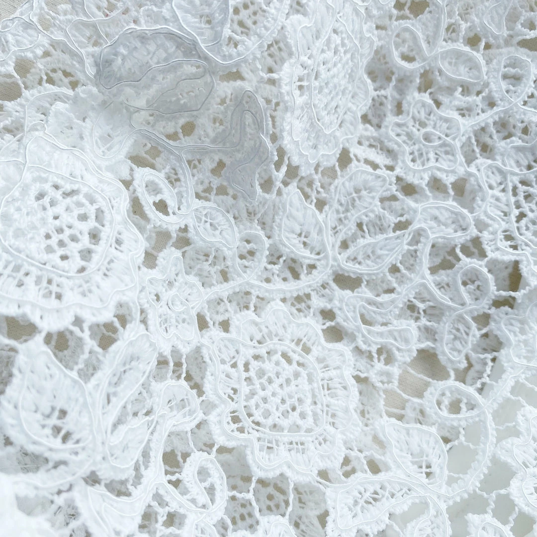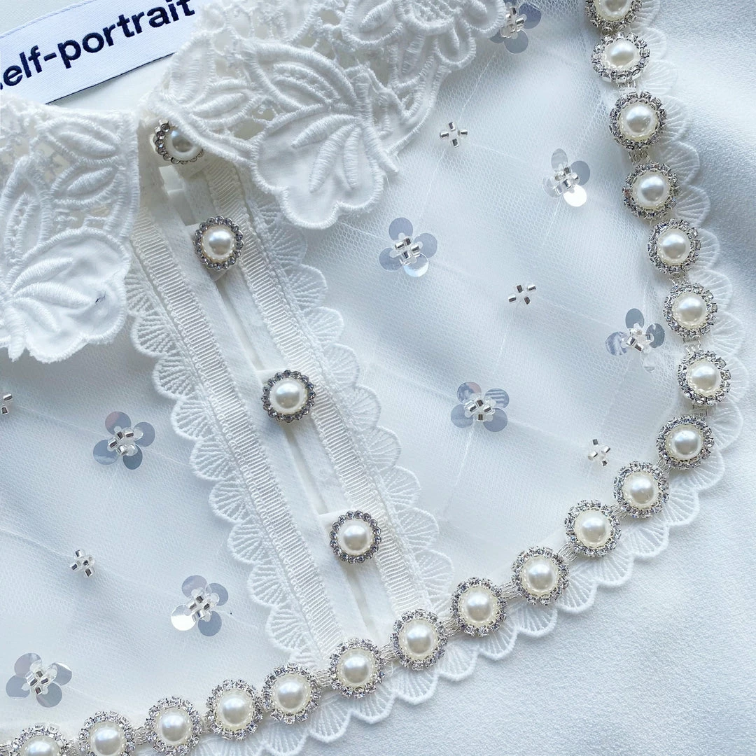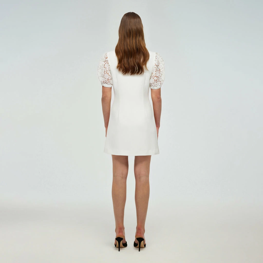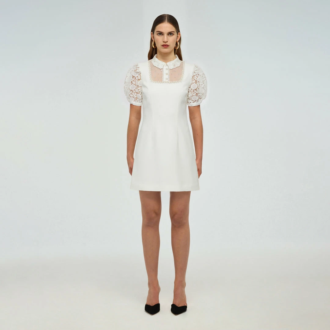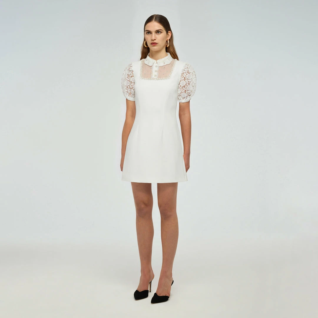 This mini dress is cut from white heavy crepe. It is designed with a beaded mesh bib detail finished with a pearl and diamanté trim. It features a guipure lace collar and sleeves. It is fitted at the waist and falls to a relaxed silhouette. Check the Size Guide to find your perfect fit.