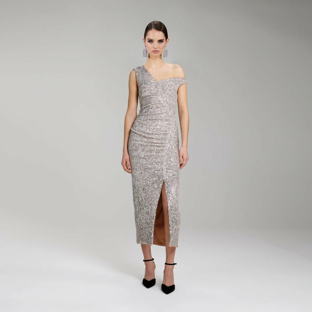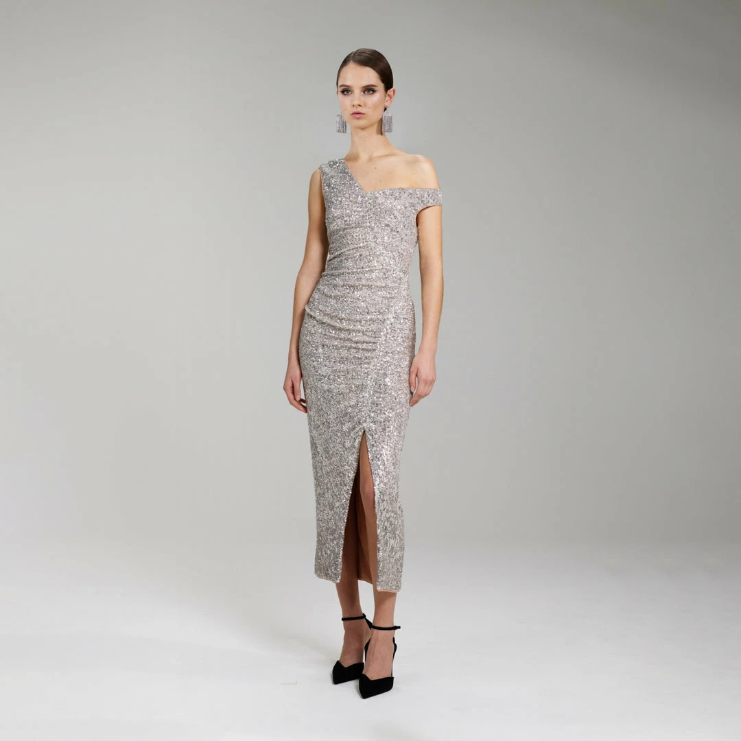 This midi dress is cut from stretch silver sequin. It is designed with a flattering asymmetric off-shoulder neckline and gathering through the dress. It falls to a fitted silhouette and is finished with a front split. Check the Size Guide to find your perfect fit.