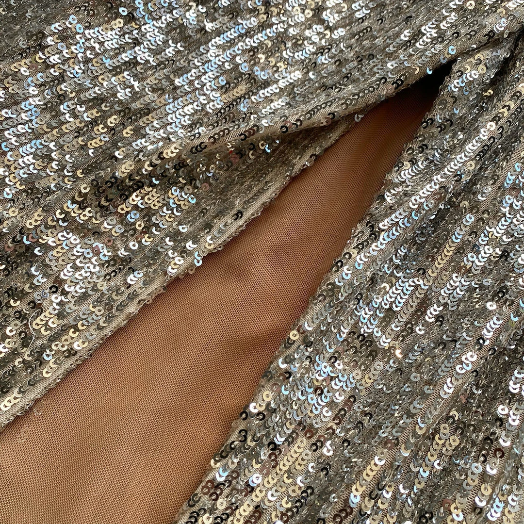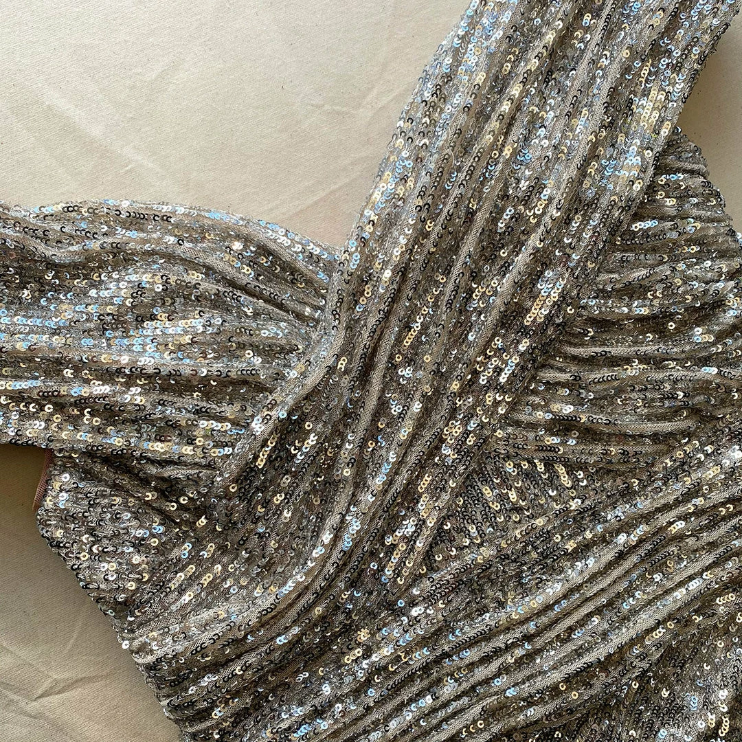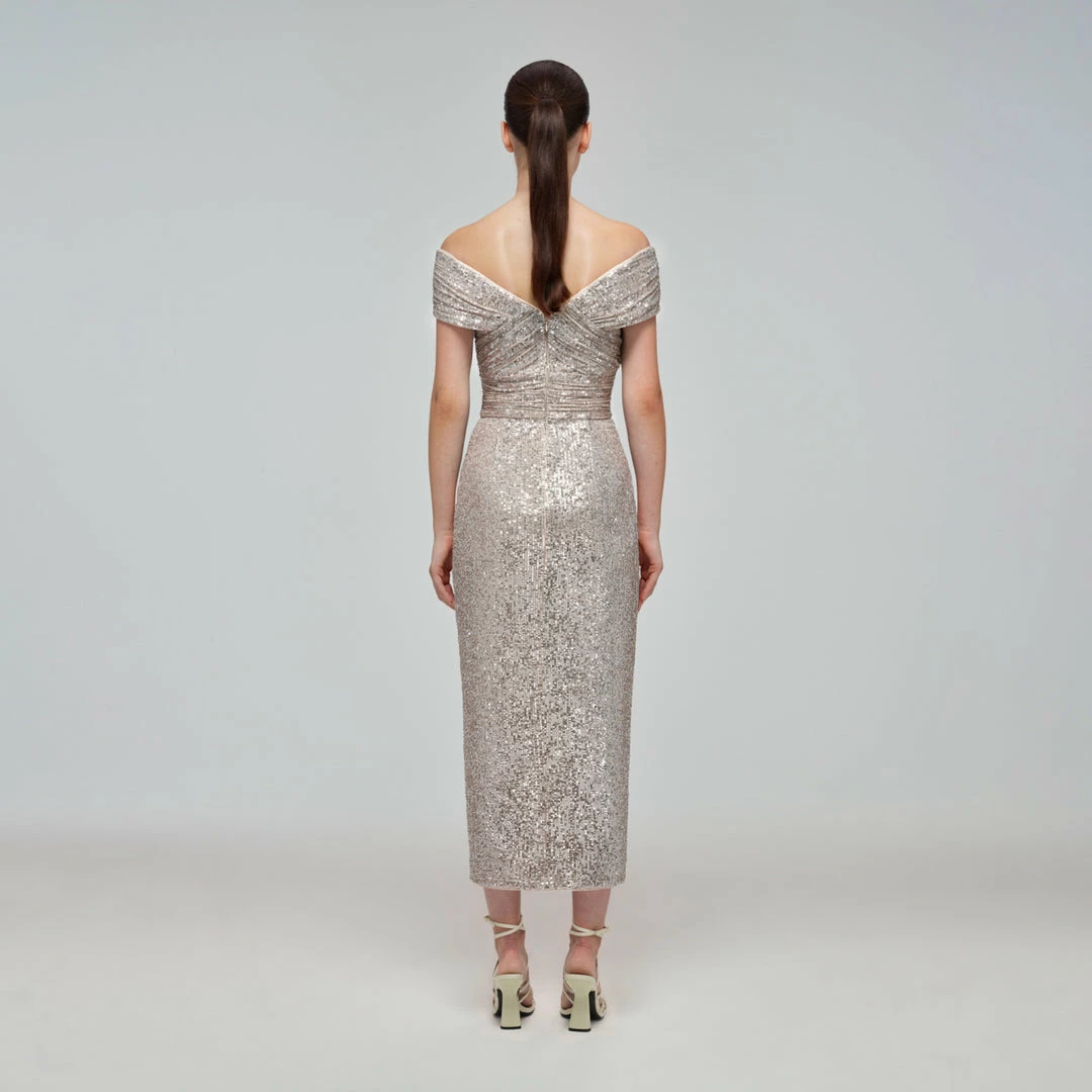 This midi dress is cut from stretch silver sequin. It is designed with a flattering off-shoulder neckline and gathering through the dress. It falls to a fitted silhouette and is finished with a front split. Check the Size Guide to find your perfect fit.
