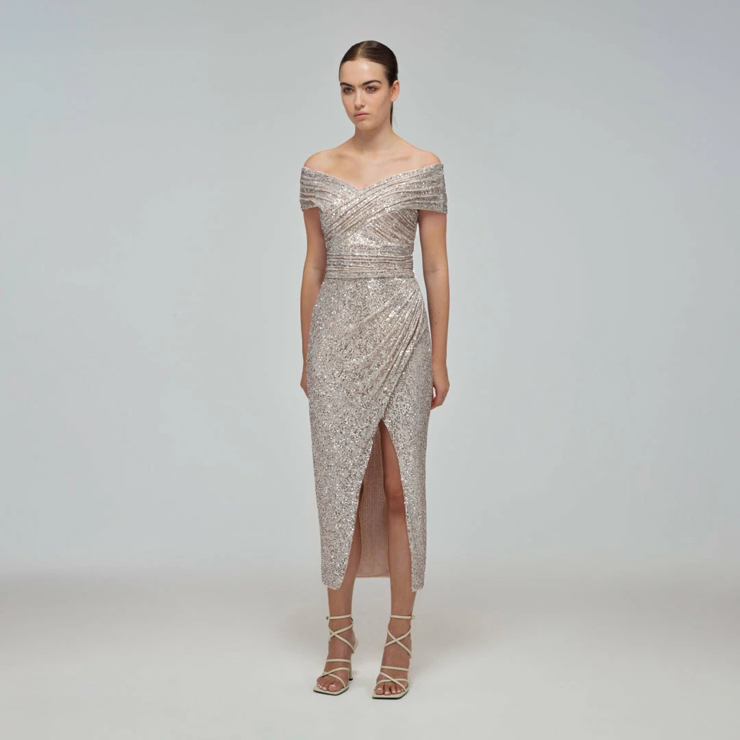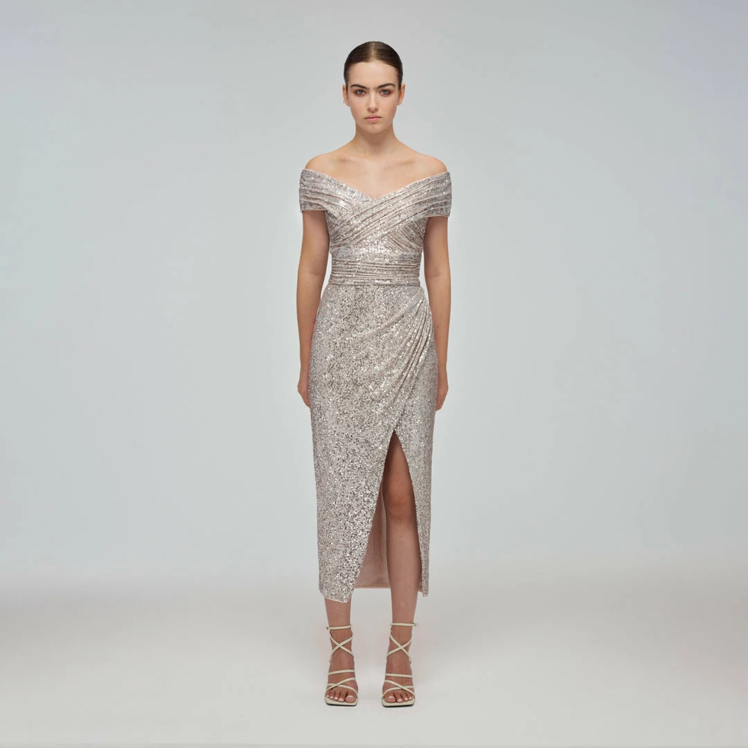 Self-portrait Sequin Off-Shoulder Wrap Midi Dress