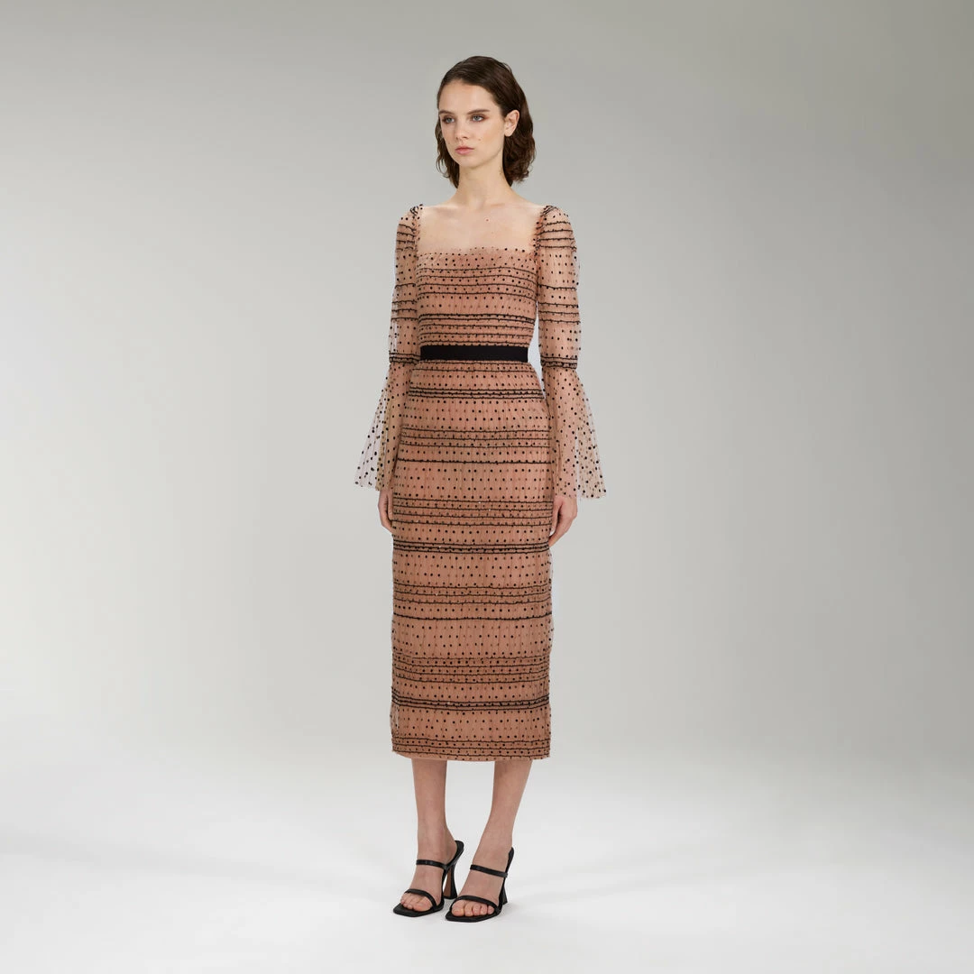 This shirred polka dot mesh dress is cut with fitted silhouette and flattering square neckline. The style features voluminous flared sleeves and a black elastic grosgrain waistband.