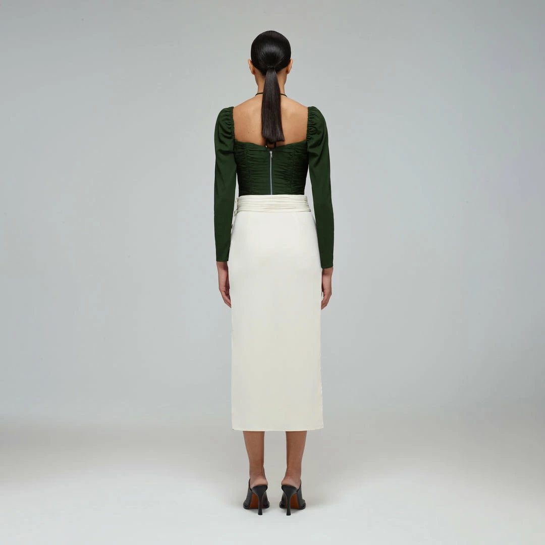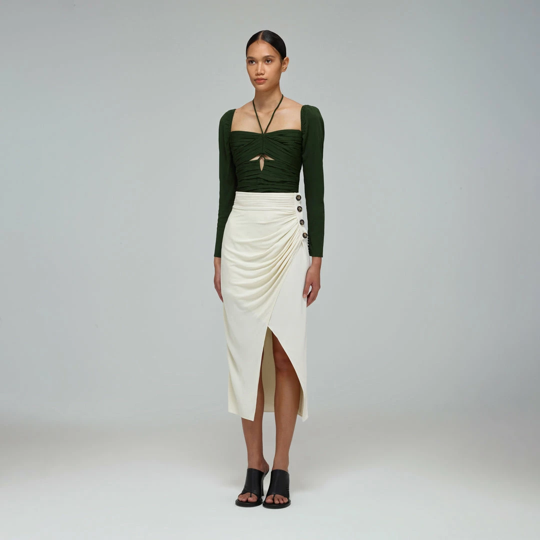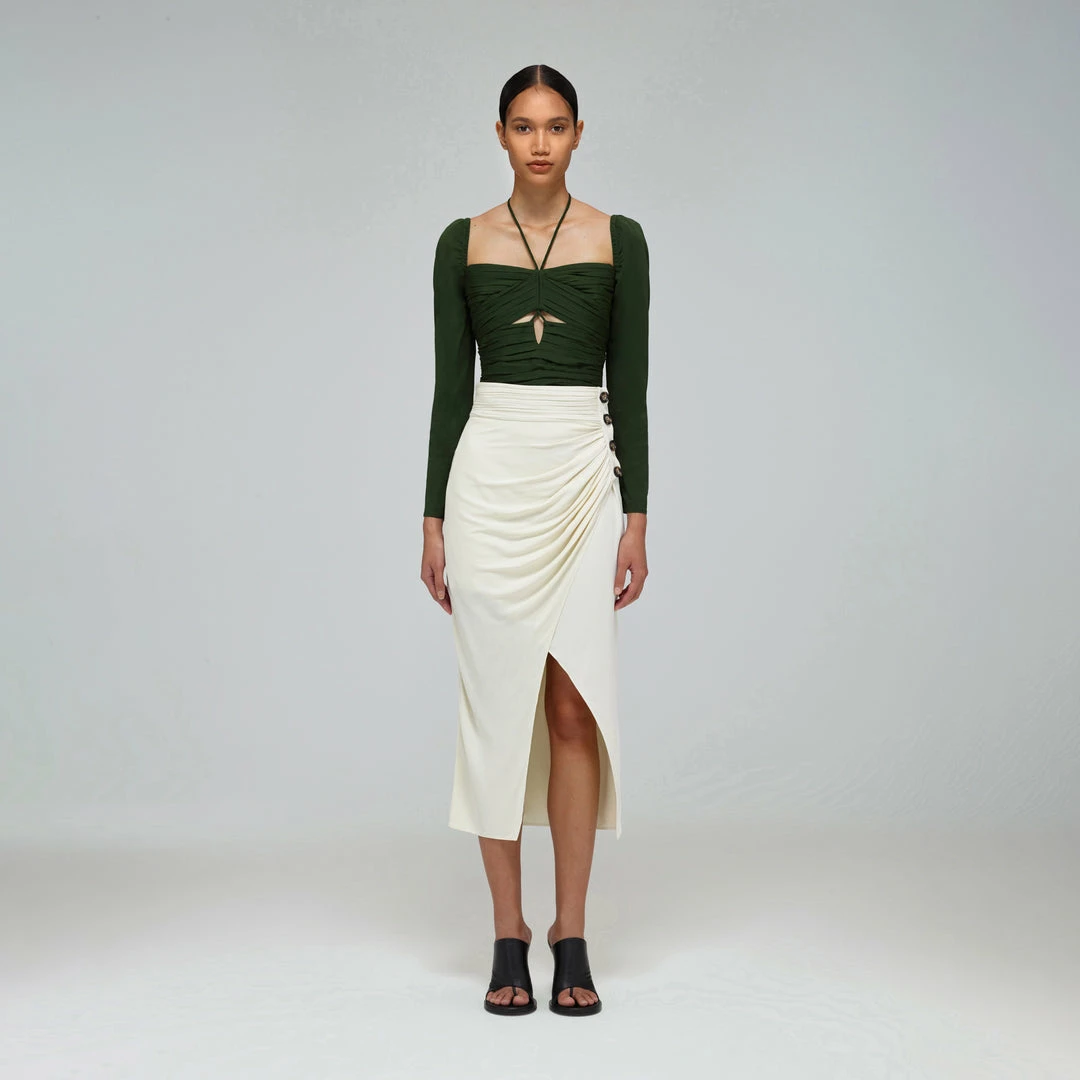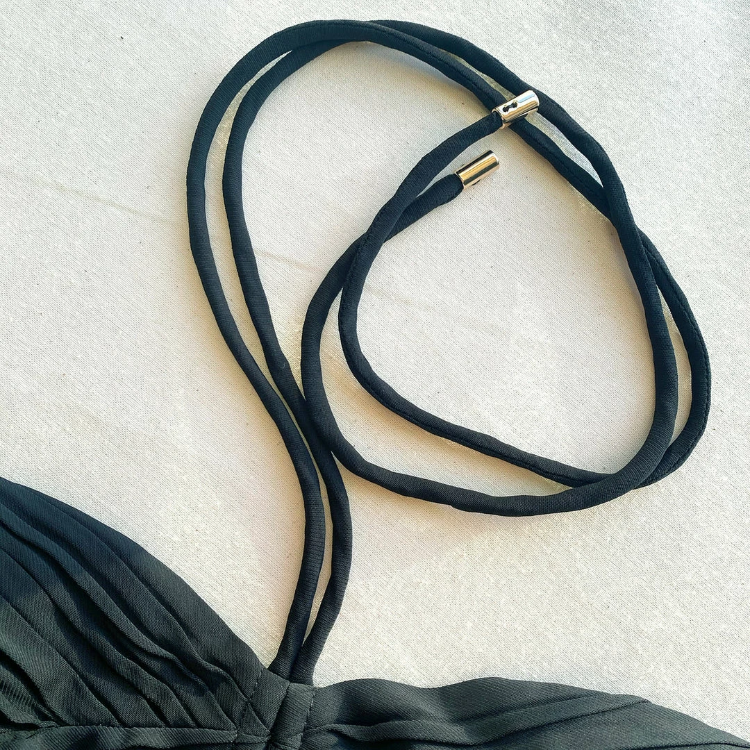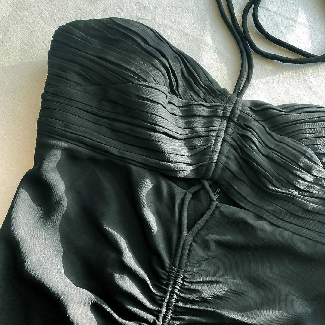 This top is cut from slate stretch crepe. It is designed with a halter neck tie and sweetheart neckline with gathering through the bust. It features long sleeves and a cut out waist. Check the Size Guide to find your perfect fit.