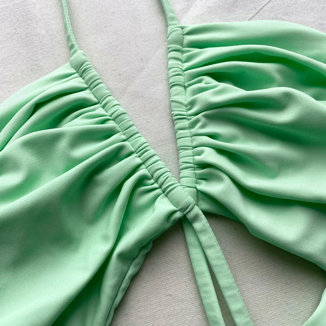 This green swimsuit is designed with a halter neck which ties at the back. It features cut outs at the front and a flattering low back. Check the Size Guide to find your perfect fit.