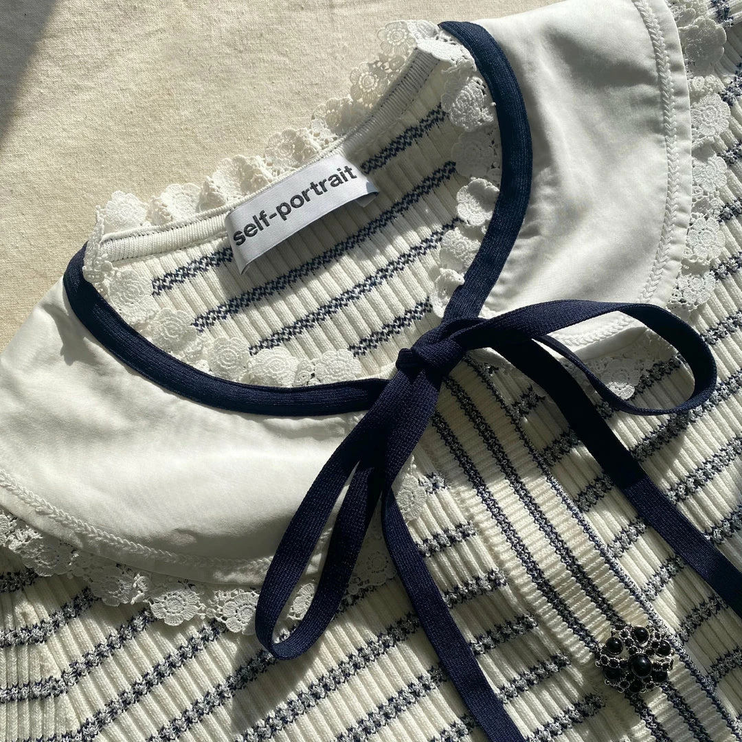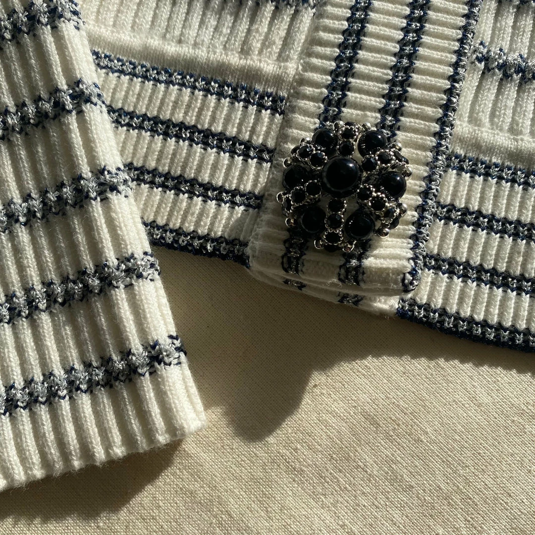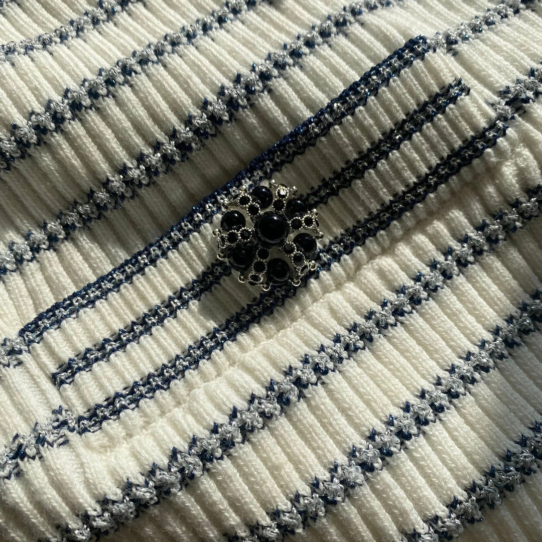 This lurex striped cropped cardigan is designed with a contrast lace trim collar and neck tie detail. It fastens at the front with diamante buttons. Check the Size Guide to find your perfect fit.
