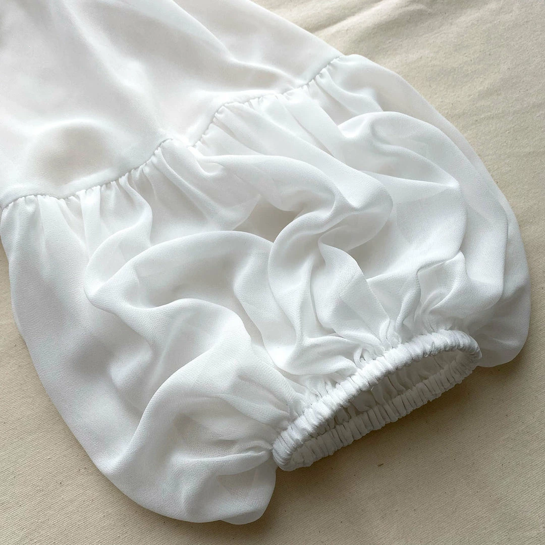 This white mini dress is cut from georgette. It is designed with a macrame trim at the front bodice and full balloon sleeves. It features adjustable waist ties giving the option to create a cinched in silhouette. The full skirts fulls to a mini length. Check the Size Guide to find your perfect fit.