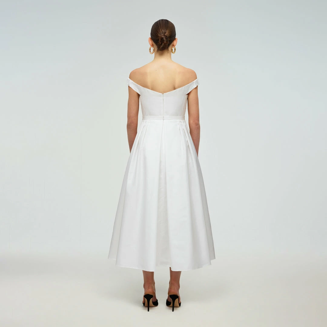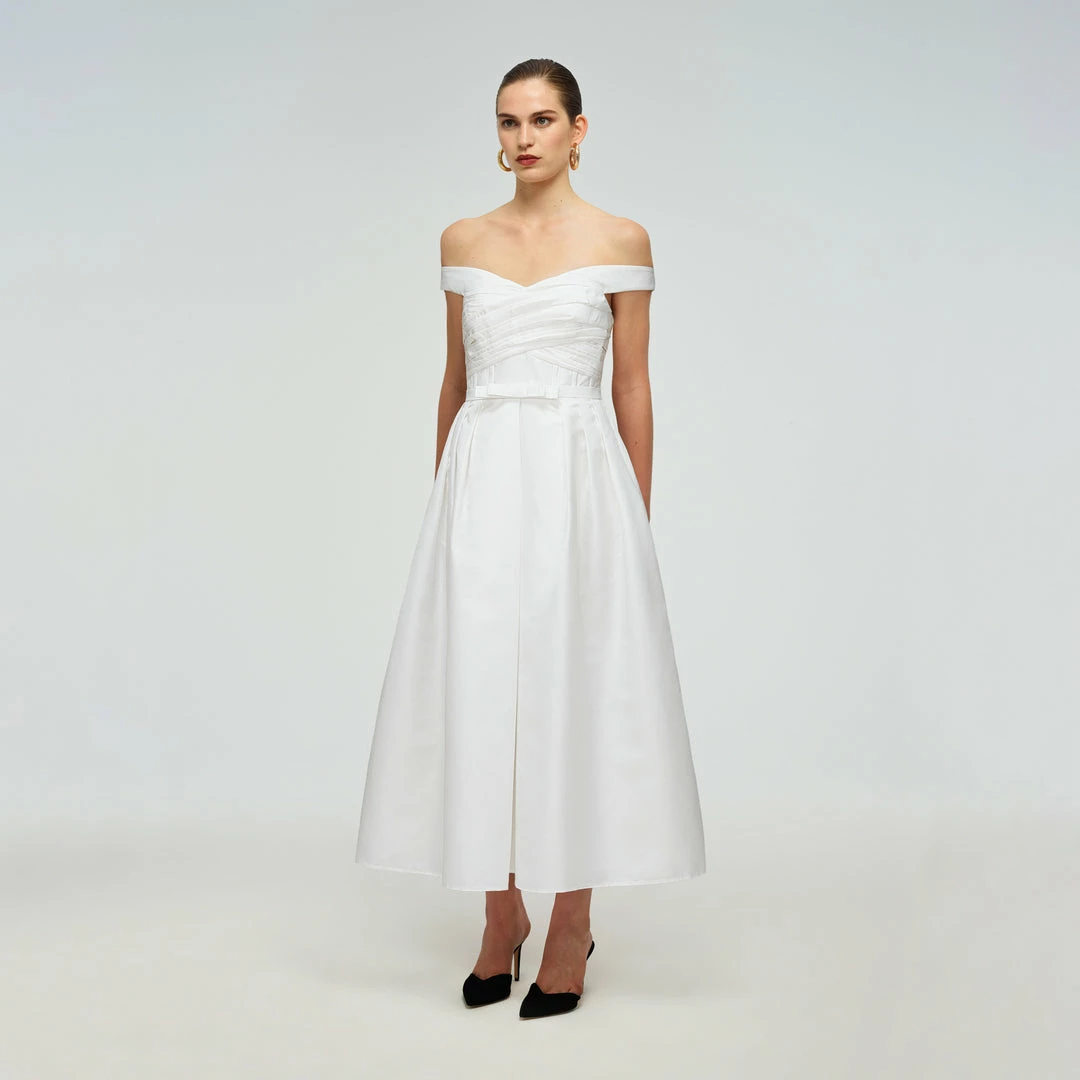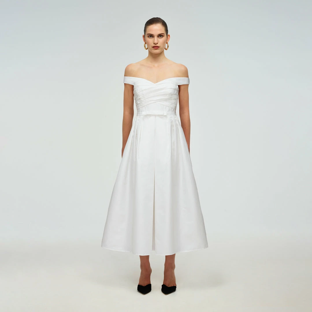 This white taffeta midi dress features an off shoulder detail. It is designed with a flattering sweetheart neckline and a gathered wrap bust detail. The fitted bodice is boned through to the waist. The full pleated skirt falls to a midi length. Check the Size Guide to find your perfect fit.