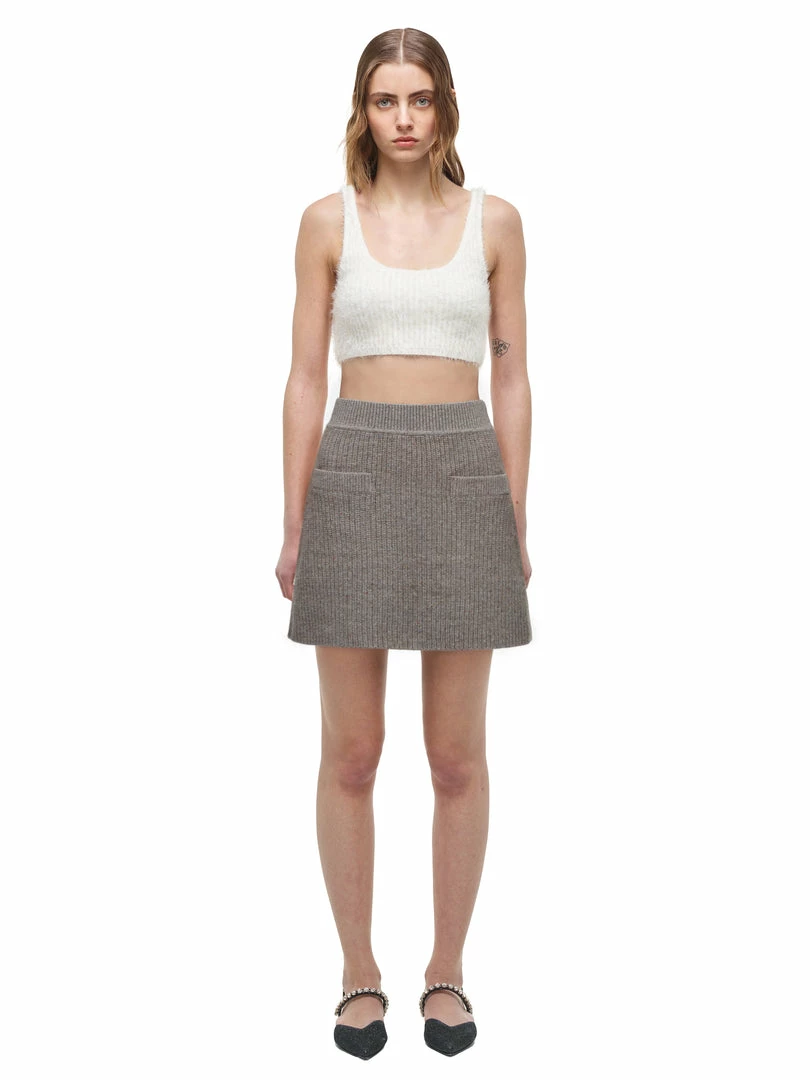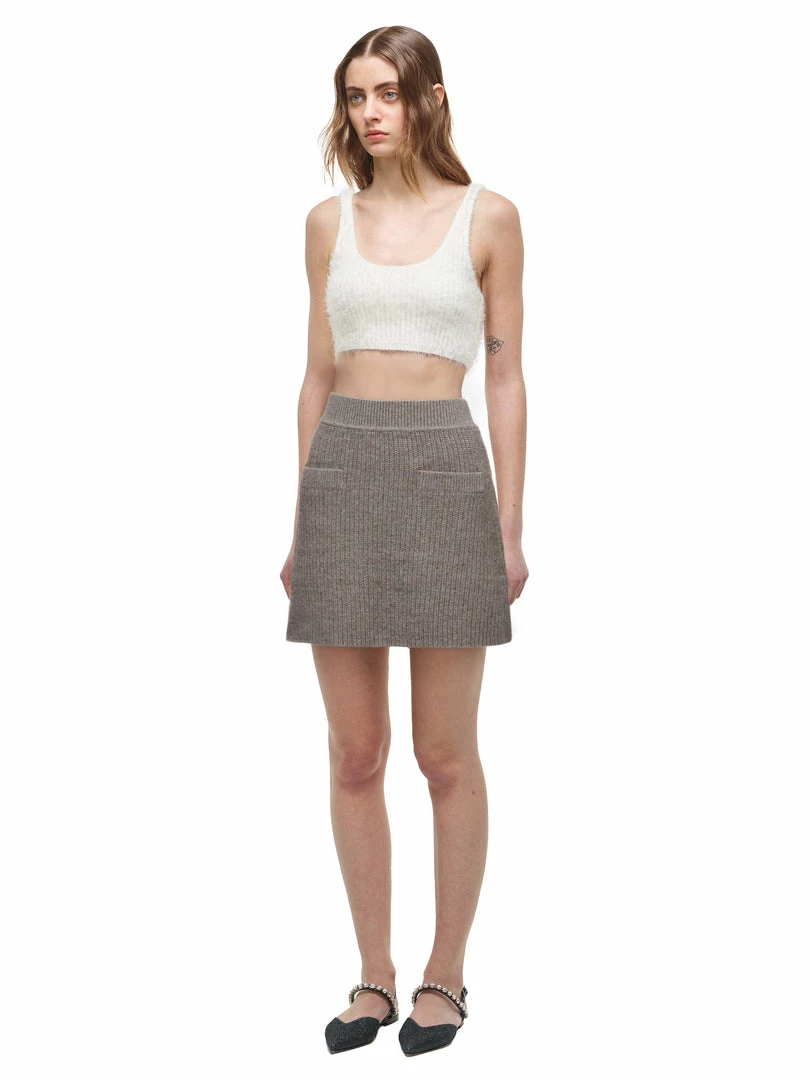 This taupe cashmere knit mini skirt is designed with a slim fitting silhouette. It features a ribbed waistband and front pockets. Check the Size Guide to find your perfect fit.